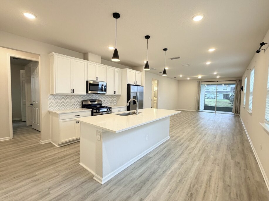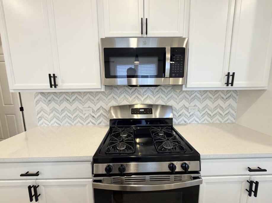 Beautiful 3-bedroom, 2-bathroom home featuring a 2-car garage and a bright, well-lit kitchen complete with quartz countertops, stainless steel appliances with a gas stove, and a built-in microwave. The spacious primary suite offers a stand-up shower, dual sinks, and a ceiling fan for added comfort. Elegant light fixtures are featured throughout the home, adding a modern touch to every room. A dedicated laundry room comes fully equipped with both a washer and dryer. Step outside to the screened-in back patio, where you can relax and enjoy peaceful views of the pond. *No Pets Allowed*