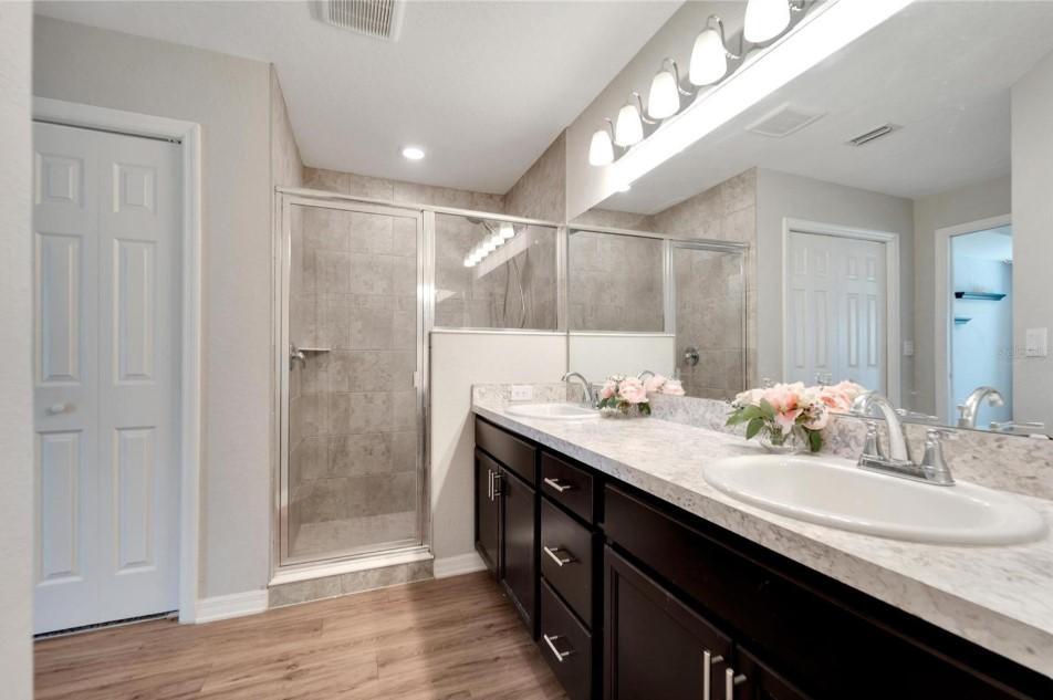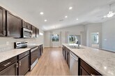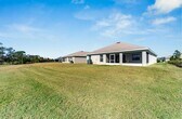 Welcome to this beautifully designed model home featuring an open floor plan and breathtaking pond views. The gourmet kitchen includes an oversized island, dark cabinetry, stainless steel appliances, and a walk-in pantry, flowing into a bright great room with glass sliders to the screened lanai. The serene primary suite offers a tray ceiling, dual sinks, decorative tile shower, private water closet, and walk-in closets. Two additional bedrooms feature upgraded accent walls, plus a full bath with dual vanities. A versatile den/study is perfect for an office, gym, or media room. Laminate flooring runs throughout, with carpet only in bedrooms and the den. Enjoy a large covered lanai, a 2-car garage, and a laundry room with added cabinetry. Community amenities include a heated pool, playground, pickleball & basketball courts, and scenic trails—all near top schools, beaches, and dining.