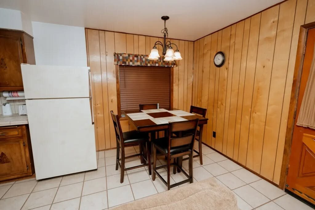 This inviting one-bedroom cottage is situated among tall pines, offering privacy and comfort. It features a private porch, a spacious living room with a fireplace, a fully equipped kitchen, a dedicated dining area, a bedroom, and a bathroom. Residents enjoy access to a community hot tub located on the main deck. The cottage is furnished and includes essential kitchenware such as pots, pans, silverware, glasses, cups, and plates. Washer and dryer on property, $4 per load. Includes utilities, wifi, water, trash, gas, electric and Roku