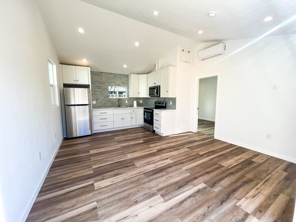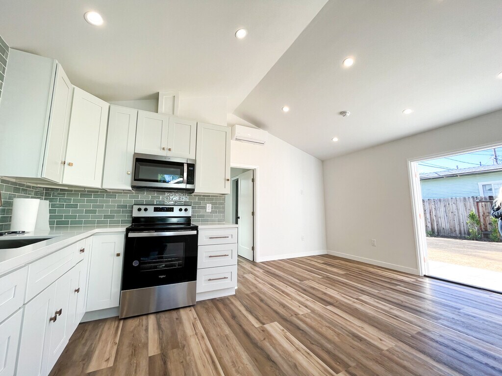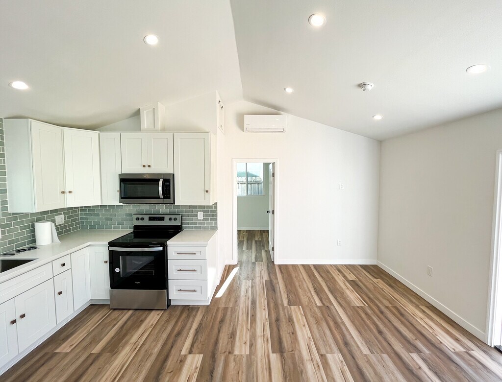 Brand new, spacious 1 bedroom + 1 bathroom back house with a private fenced-in yard. Right off Ventura Ave on a quiet street, just a short distance from historic downtown Ventura, Main Street, bike trails, the beach, and Ojai. This unit was recently built from the ground up so everything is completely new! Features vaulted ceilings, AC/ Heater, kitchen with tile feature wall, modern fixtures, faucets and appliances, recessed lighting throughout, bedroom with large closet, tiled bathroom with bathtub, spacious solid wood/marble vanity, and additional built-in wall storage. Includes washer/ dryer (shared with front tenant) and newly landscaped private fenced-in yard with a shed for additional storage, olive trees, fruit trees, and decomposed granite. The driveway provides off-street parking for 1 car. Highlights: - Washer/ dryer shared with front house - 1 Off-Street Parking Space - AC / Heater - Private fenced-in recently landscaped with olive and fruit trees and decomposed granite -Pet friendly Available from January 2025. Reach out to schedule a tour! *Tenants are required to carry their own renter's insurance policy.