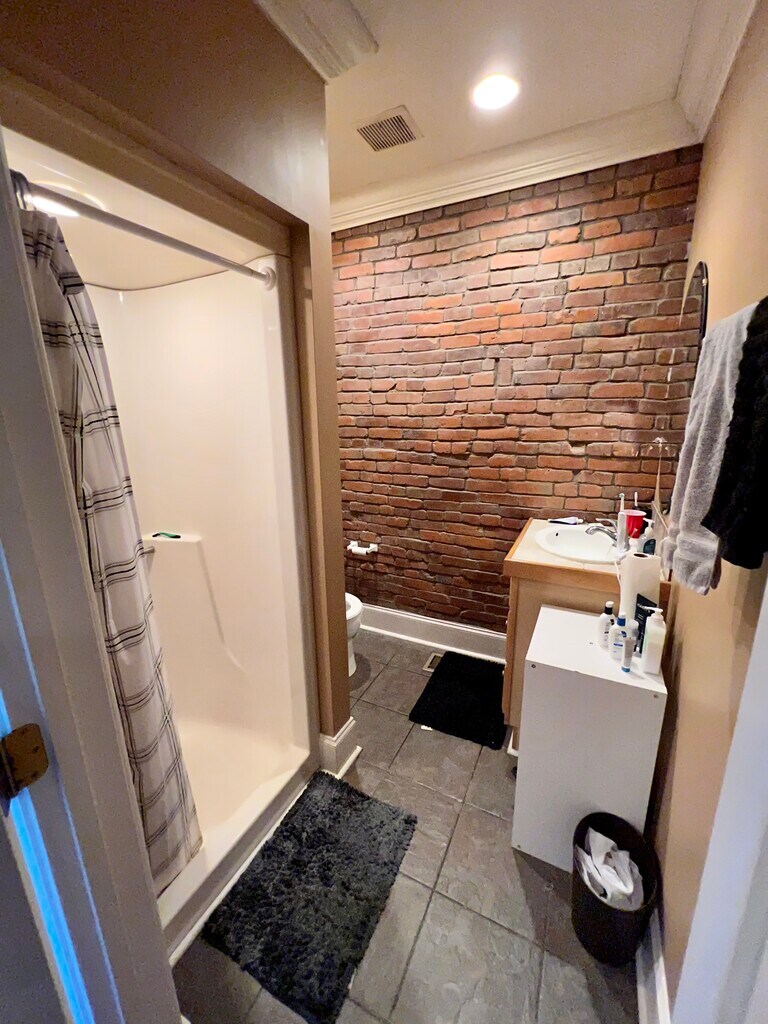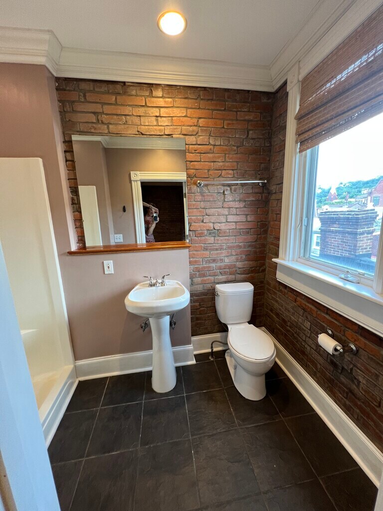 Bright and spacious industrial style 2 BR / 2.5 BA apartment on a quiet street but close to everything! High ceilings, exposed brick, huge windows, hardwood floors, central heat and A/C, in-unit washer/dryer, spiral staircase, fireplace, ensuite full baths for each bedroom, ample closet space, and a half bath on the main floor for convenience/guests make this beautiful apartment perfect for relaxing after a long day or entertaining. Steps away from East Carson St. restaurants, boutiques, cafes, entertainment, South Side Riverfront Park, Three Rivers Heritage Riverfront Trail, and just a short ride/drive from Oakland, Downtown, and the East End. Main floor is open plan with kitchen, powder room with laundry, and on the upper floor the 2 bedrooms each with its own ensuite full bathroom with shower. Please note the open spiral staircase leading to upper floor. (Dogs are not usually big fans but cats are ok with them!). Water is included in rent. Free street parking. Pet fees may apply. Application includes background check. Accessibility information: street parking is first come, first served, and there is one handicapped spot across the street about 30 ft down. To enter the apartment from the sidewalk, you pass through a large gated door to a long narrow walkway between the buildings (only about 3 ft wide) to the rear of the building. There is a wrapping set of stairs, about 12, up to front door of the apartment. Inside the apartment there is a narrow, open spiral staircase that leads to the upper floor bedrooms (about 12 stairs). Apartment does not have a bathtub.