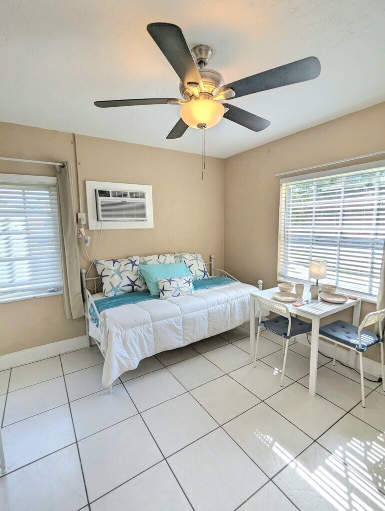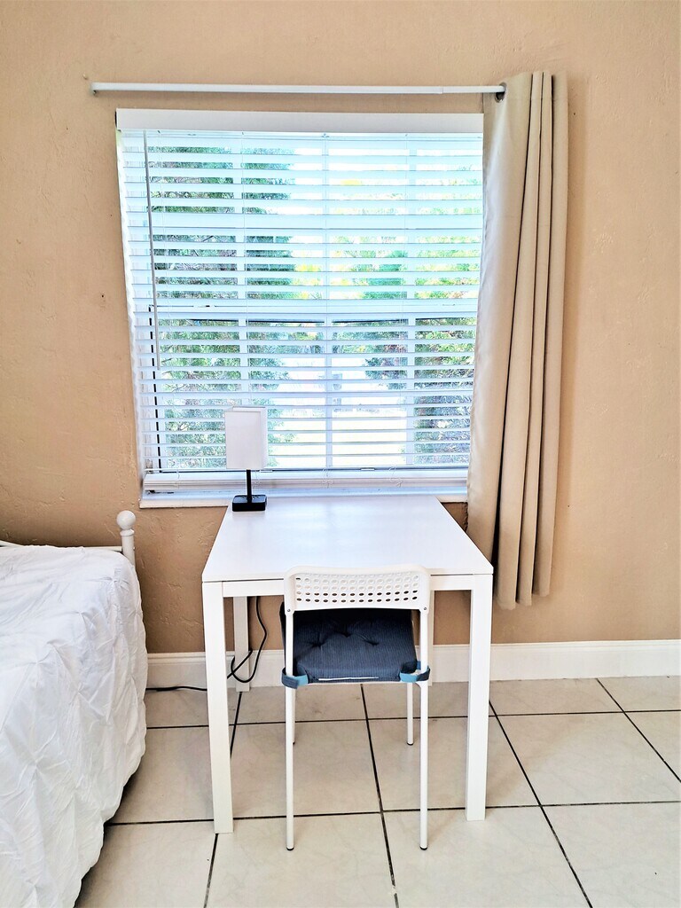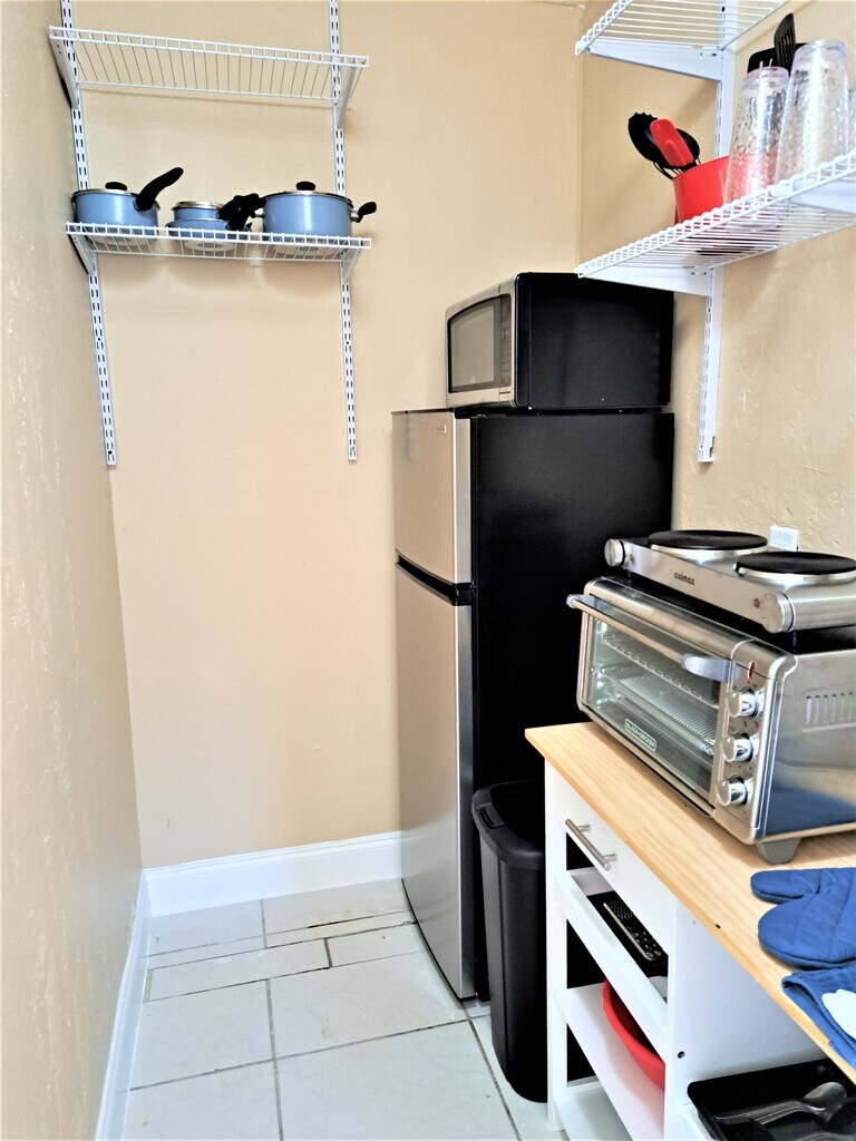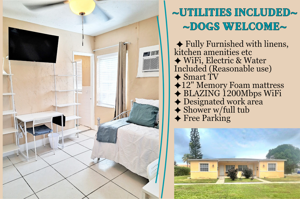BIG DOGS WELCOME! FURNISHED, WI-FI, ELECTRIC, PARKING, KITCHEN SUPPLIES & LINENS INCLUDED***Welcome to our cozy studio apartment, set in a charming garden complex, in Hollywood Beach, Florida! Perfectly located just minutes away from the beach, or from downtown Hollywood with easy access to Miami or Ft. Lauderdale. Our studio, although compact, is thoughtfully furnished with everything you (and furry family member) need to feel comfortable. __________________ SLEEP: You'll enjoy a comfortable night's sleep on a 12-INCH MEMORY FOAM MATTRESS with fluffy pillows & a blanket. You can lounge comfortably watching the wall-mounted SMART TV. Wake up refreshed and ready to start your day. The convenient BED-SIDE EXTENSION CORD ensures that you have easy access to charge all of your devices. The nearby TABLE LAMP provides cozy lighting for reading or enjoying TV. __________________ RELAX: Whether you're looking to relax after a long day or simply unwind with your favorite show, our wall-mounted SMART TVs will provide you with a high-quality viewing experience for streaming your favorite subscription services (Netflix, etc.). __________________ WORK/Wi-Fi: Be productive with our blazing 1200Mbps Wi-Fi at the designated DESK area with USB/charging connections. It’s a great un-cluttered work area with ample space, storage in the two 5-SHELF BOOKCASES and easy access to plug all of your devices into the power strip provided. The desk LAMP provides additional lighting to avoid eye fatigue. __________________ COOK/DINE: All you need for cooking healthy meals at home - the kitchenette is stocked with pots, pans, cooking utensils, a COFFEE MAKER, MICROWAVE, AIR-FRYER TOASTER OVEN (you can fit a small chicken), DOUBLE HOT PLATE, and a medium-sized REFRIGERATOR and FREEZER, giving you the option to prepare a home-cooked meal when you prefer, rather than always enjoying the restaurants in the area. Plates, glasses, cutlery, knives, hot mitts, cutting boards, measuring cups etc are all included to make your meal prep a breeze. A kitchen island provides counter space and storage. Six wall-mounted shelves provide plenty of STORAGE for pantry and other kitchen items. All you need for cooking healthy meals at home. And when you’re done, the cozy DINING TABLE is a comfortable spot to enjoy your meal. __________________ CONVENIENCES: But if cooking isn't your thing, don't worry! There are multiple delivery services available in the area such as Instacart, Uber Eats, and others, which can deliver delicious meals from nearby restaurants, grocery or alcohol stores straight to your doorstep. You can sit back, relax, and enjoy your meal in the comfort of our cozy studio. __________________ BATHE: The TUB/SHOWER combo is spacious for a nice hot shower. The OVERSIZED STAINLESS STEEL DEEP UTILITY SINK for washing dishes, clothes and bathroom needs. The MIRRORED MEDICINE CABINET provides plenty of room for toiletries and is supplemented by 3 wall-mounted DEEP STORAGE SHELVES for even more storage of towels and other bathroom items. __________________ CLOSET AREA: A 4' CLOSET SYSTEM features ample space to store all your clothing and accessories. A full length mirror helps you "check your look" before heading out on the town. Non-slip hangers and a laundry basket are also provided to help keep you organized. __________________ STORAGE: Our apartments are designed with plenty of storage options to ensure that you feel right at home. In the kitchenette and bathroom areas, you'll find several shelves where you can keep any additional items you may have, such as non-perishable groceries or toiletries. The bed frames are also raised to provide you with plenty of under-bed storage. __________________ UTILITIES INCLUDED: 1200Mbps shared Wi-Fi, electricity & water (reasonable usage), trash, lawn. Excess usage is charged to the Tenant as specified in the Lease. FREE Wi-Fi: BLAZING FAST 1200MbpsWi-Fi, provided by Comcast Xfinity is ideal for remote work, gaming or streaming __________________ PARKING: You'll have one FREE OFF-STREET PARKING space at no additional cost, ensuring convenient access to your vehicle. Additional free street parking is often available on a first-come, first-served basis. __________________ YOUR FURRY FAMILY: We understand that pets are an important part of your family, which is why we welcome big dogs in our apartments & studios. We want you to feel at home with your furry companion by your side. There is even a large grassy area on the property as well as charming streets nearby to enjoy with your furry family member. We can provide you with options for nearby dog parks and even info about the DOGGIE BEACH! (A pet fee applies) __________________ SHARED YARD AREA: Take advantage of the shared access to the LARGE GRASSY AREA on the property, which offers ample space for your furry friend to play and exercise. __________________ SHARED OUTDOOR PATIO: You can also enjoy shared access to a SMALL FRONT PATIO with 2 chairs and table, convenient to sit outside with your furry family member or for smokers. __________________ OCCUPANCY: Maximum occupancy: Studio: 1 __________________