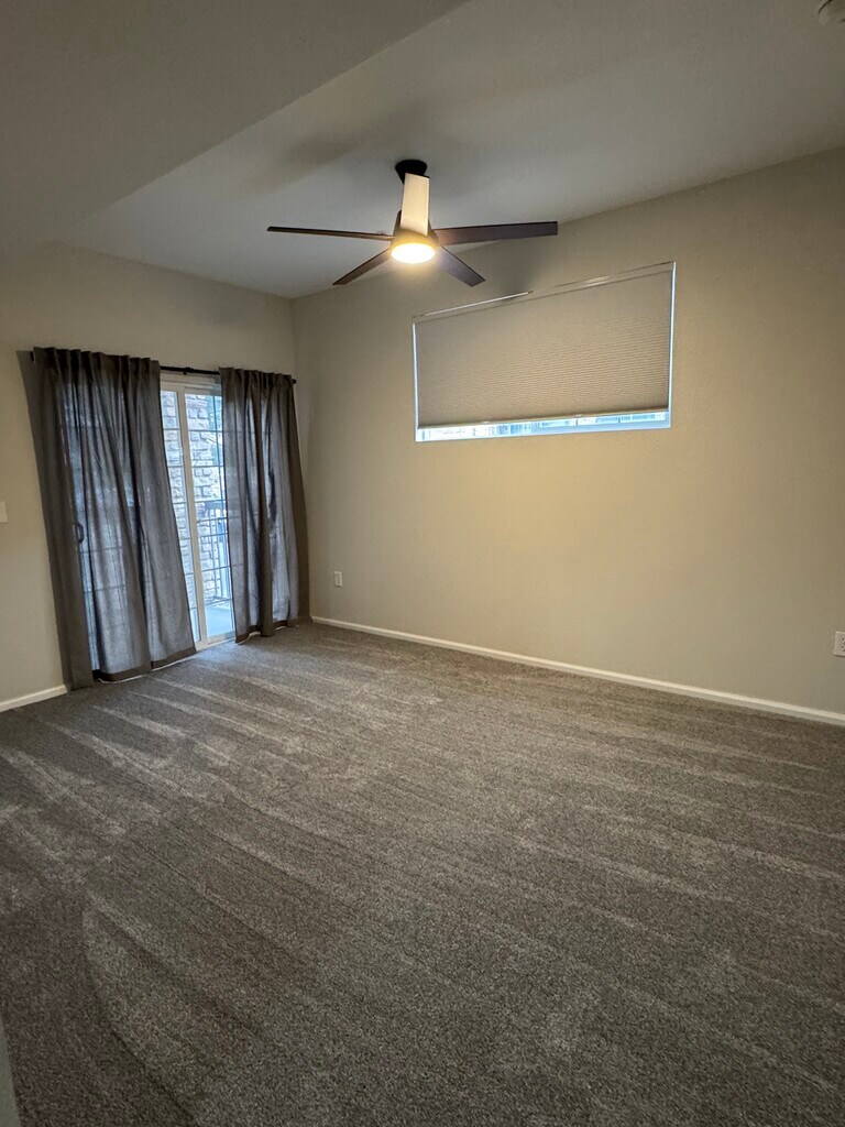 Lovely, updated 2 bed, 2 bath condo. All new appliances and new carpet. The condo has an open layout, and the bedrooms are separated by the living area and kitchen. It is located on the first floor and each bedroom has a walk in closet and patio. The unit has a large laundry room and a small out door storage closet (not pictured). Additionally, there is one covered parking space included. The building amenities include- a pool, a play area, volleyball net, workout room and easily accessibly to walking trails.