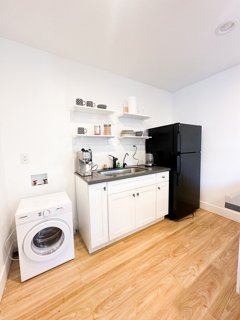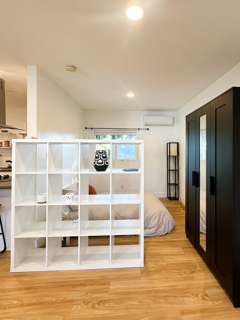 A beautiful newly renovated detached ADU / back house with its own entrance. The studio has pristine white walls and hardwood floors and come equipped with an electric stove, fridge, microwave and a washer and dryer combo. The unit has a water softener and a reverse osmosis water filter for drinking water. Studio comes partially furnished with a wardrobe, barstools and a quality pull out bed with a comfortable mattress. Water, trash and high speed internet are included in the rent. The studio is just a 5 min walk from the University of La Verne and 10 min walk from the quaint downtown area. There is one off street parking spot and additional street parking can be applied through the city.