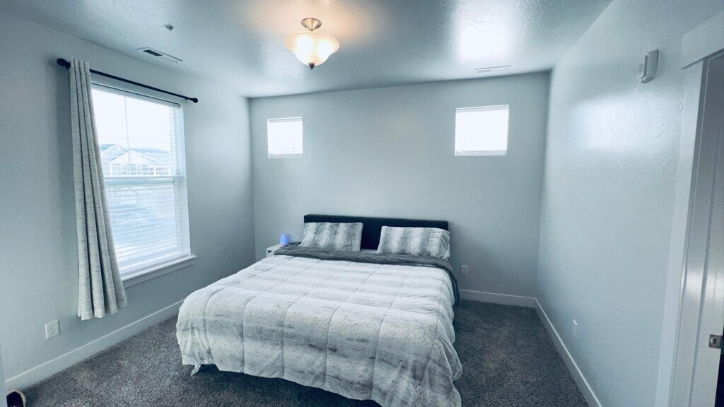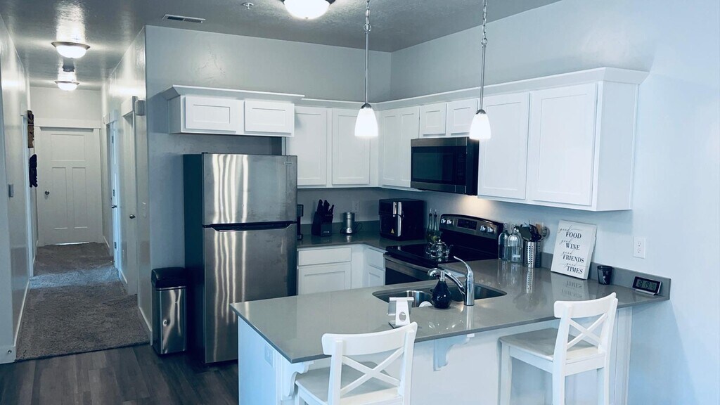 Beautiful 3-bedroom/2-bath condo with garage. Located on the middle (2nd) floor, this unit has wonderful features, from the gray quartz countertops to stainless steel appliances, all the way up to the beautiful light fixtures! And with so much natural light! Washer and dryer will be included in the unit. The assigned garage is at the bottom of the stairs. Spacious master bedroom with ensuite bath and walk-in closet. This open floor plan condo also features both a bar and dedicated dining space, plus a private balcony, giving you plenty of space to entertain. Plus an oversized laundry/utility room and extra storage in the pantry and closets. Resident to pay gas & electric utilities. Residents must have gas and electric in their name prior to moving in. The HOA fee is paid by the owner. HOA includes clubhouse, pool, gym, water, sewer, and garbage. Conveniently located just off Pony Express for easy access anywhere! Nearby Costco, restaurants, shopping areas, and parks! Conveniently close to Mountain View Corridor and the new Primary Children’s Hospital and other medical and dental offices.