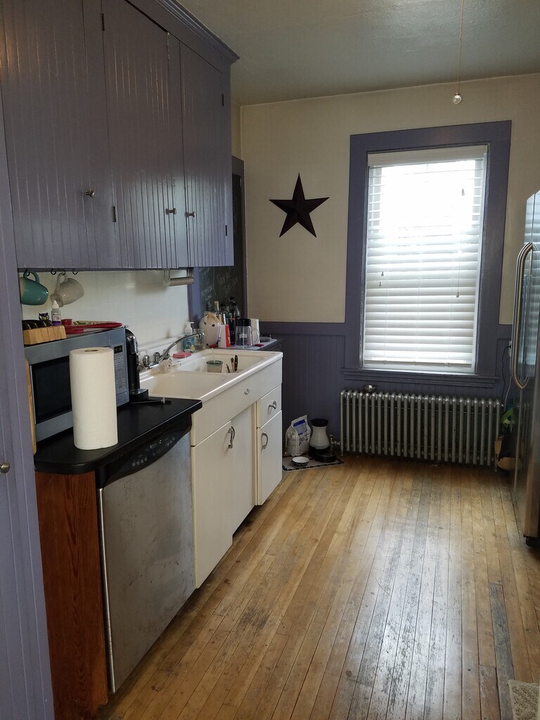 Spacious first floor apartment with dedicated driveway and garage. Refinished floors, and fresh paint just done this month! Flexible layout with 1BR, 1 living room, 1 spare area/office/den, + kitchen and bath. Also has a four season sunroom. Located on a quiet street right downtown. Stainless steel appliances. Lot's of storage. Off street parking for two cars + the garage. Nice back yard. Free laundry in basement. No smoking. No dogs. Check out the location on a map or drive by. Its a prime spot. Please call/write Andrew. Available March 1.