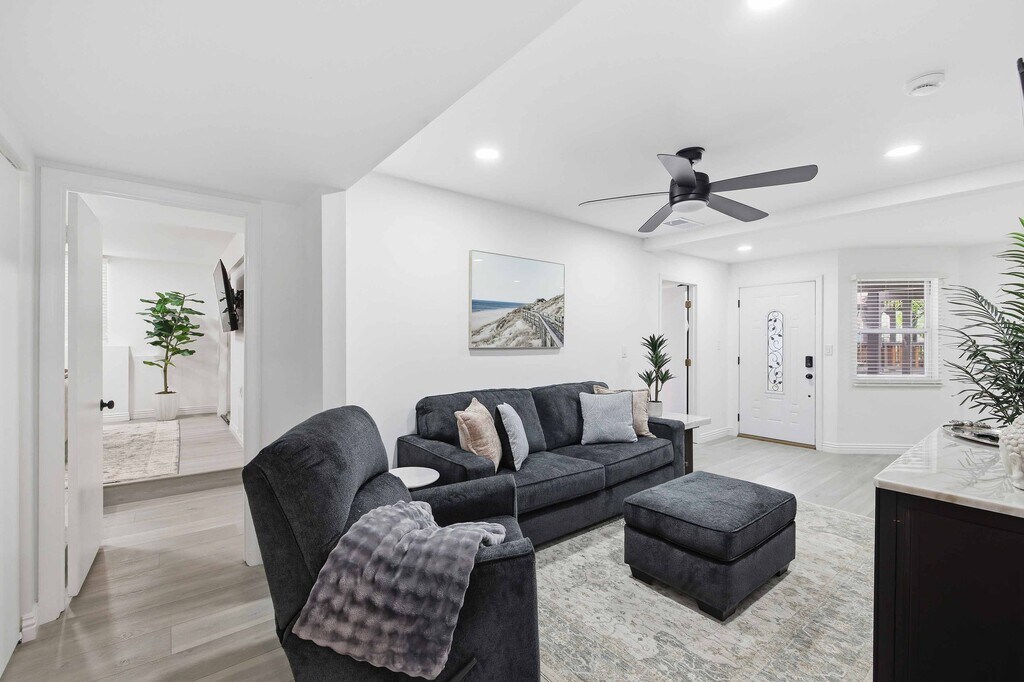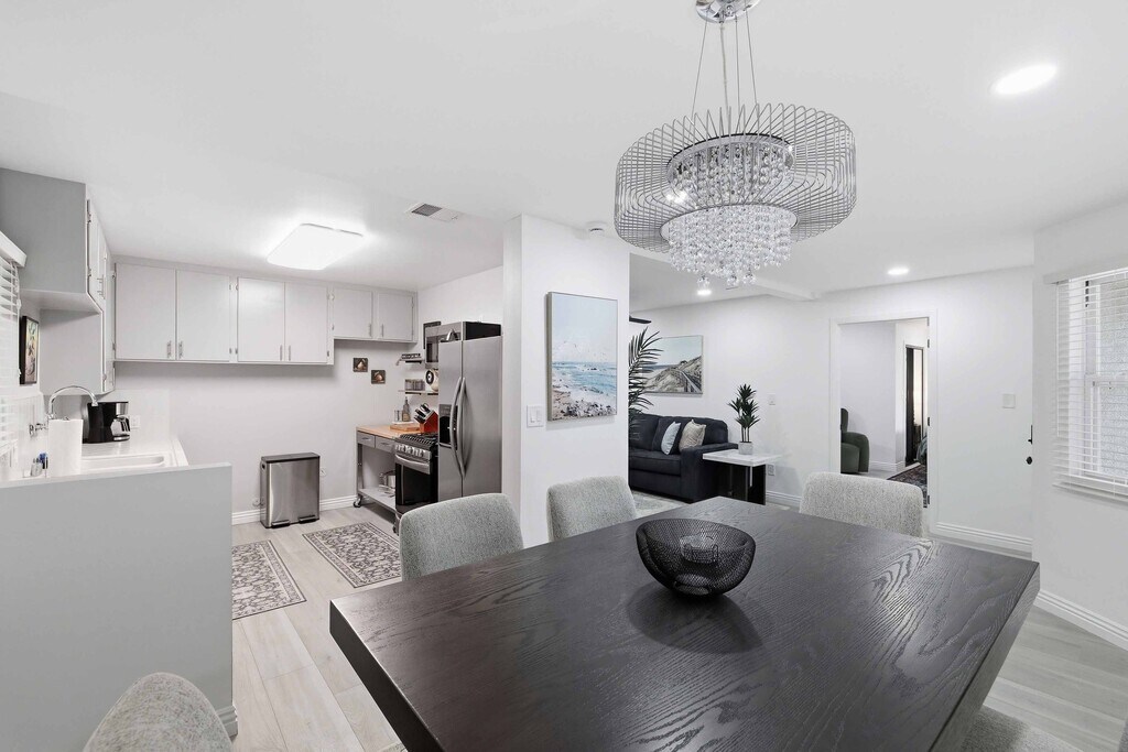 Furnished Rentals (1-11+ Month Terms) Beautifully remodeled 2-Bed (1-King & 1-California King) 2-Bath lower-rear unit with 850 Sq. Ft. of bright, comfortable living space on a quiet street with air conditioning! This single-level apartment features an open kitchen, stylish chandelier/furnishings, & a great flow throughout. Step outside to your large yard/gazebo (shared) & private patio, perfect for relaxing or entertaining, equipped with a BBQ + dining area for six. Inside enjoy updated bathrooms, a walk-in closet, pantry, ceiling fans, & the convenience of in-unit laundry + easy parking with your own 1-car driveway space (Left Side). Prices go up during the Summer months. Small pets considered!