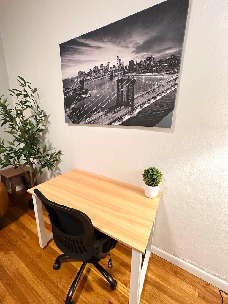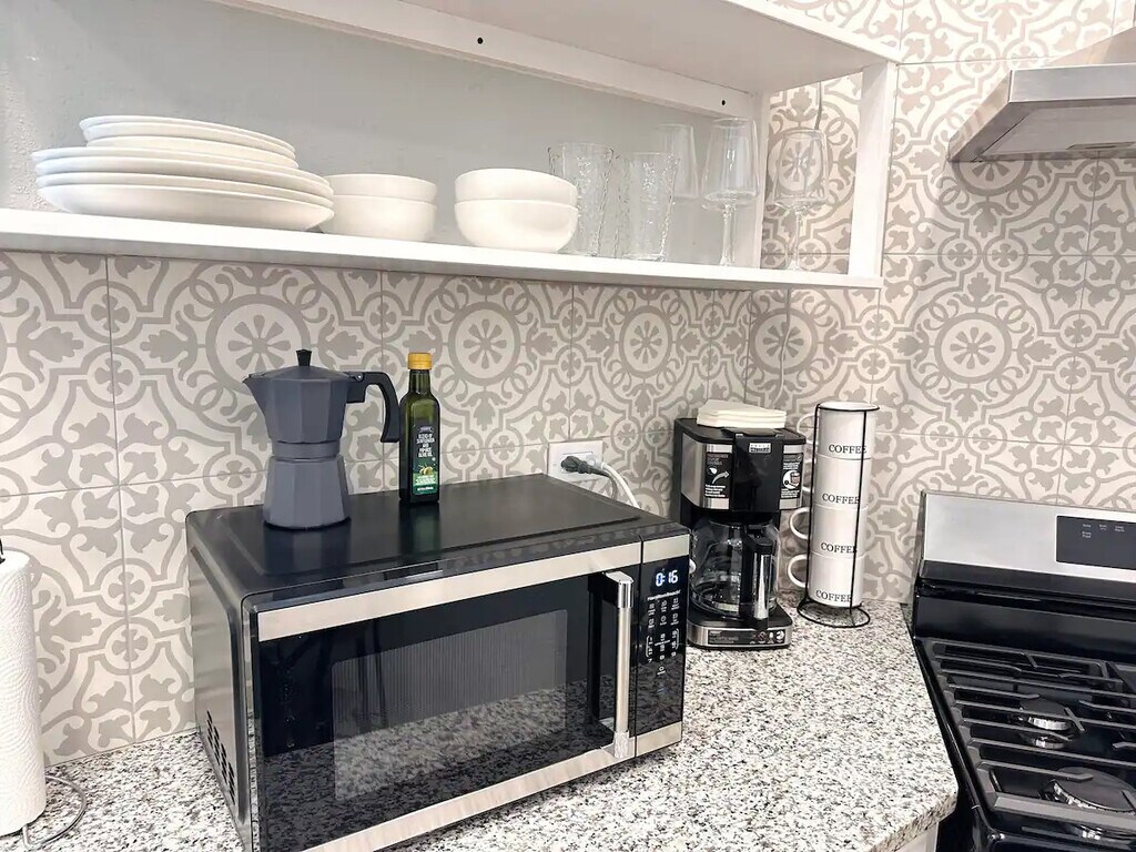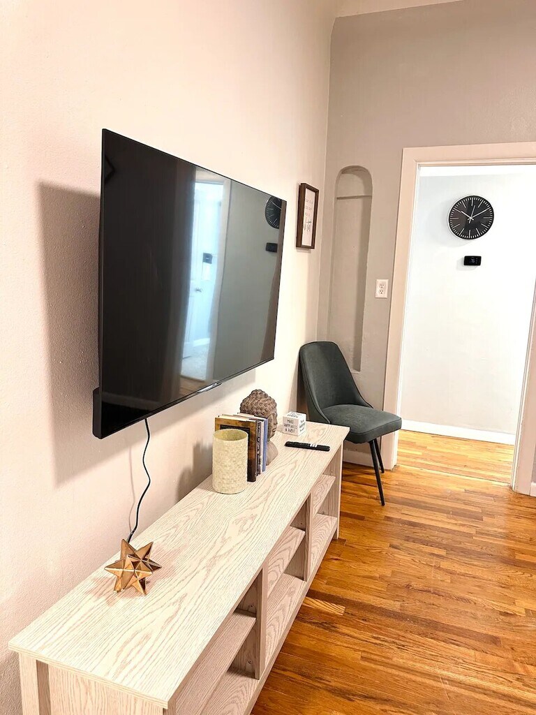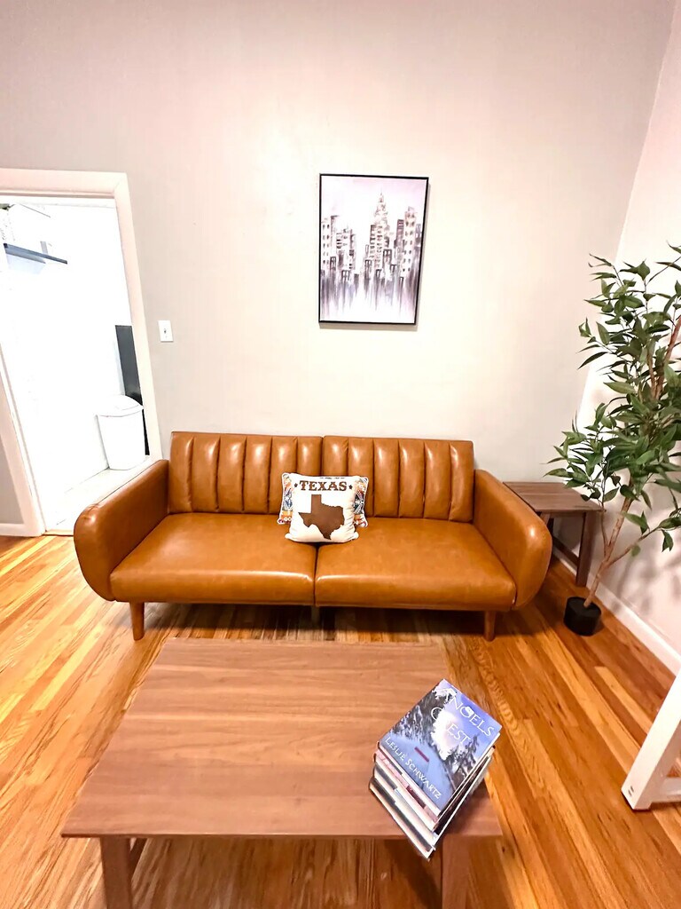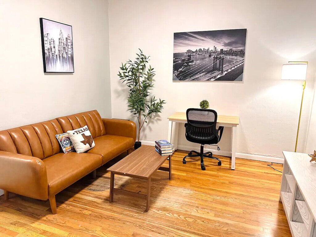 Explore our new one-bedroom tiny home with a queen-size bed, 12-inch mattress, and ample storage. The room is bright, featuring blackout curtains for optimal rest. Relax in the living area with a comfy sofa and 58-inch 4K TV. Includes a dining space, work desk, fast 100 Mbps internet, and a fully-equipped kitchen with a coffee corner. The bathroom is designed with a relaxing bathtub and stylish tiles. Perfect for both relaxation and productivity. -El Paso Furnished Homes.