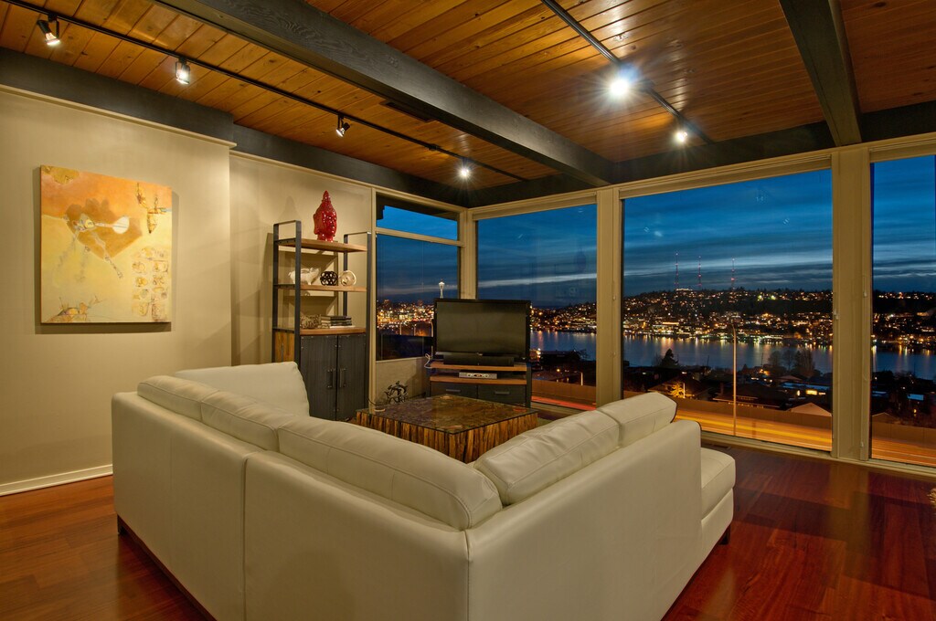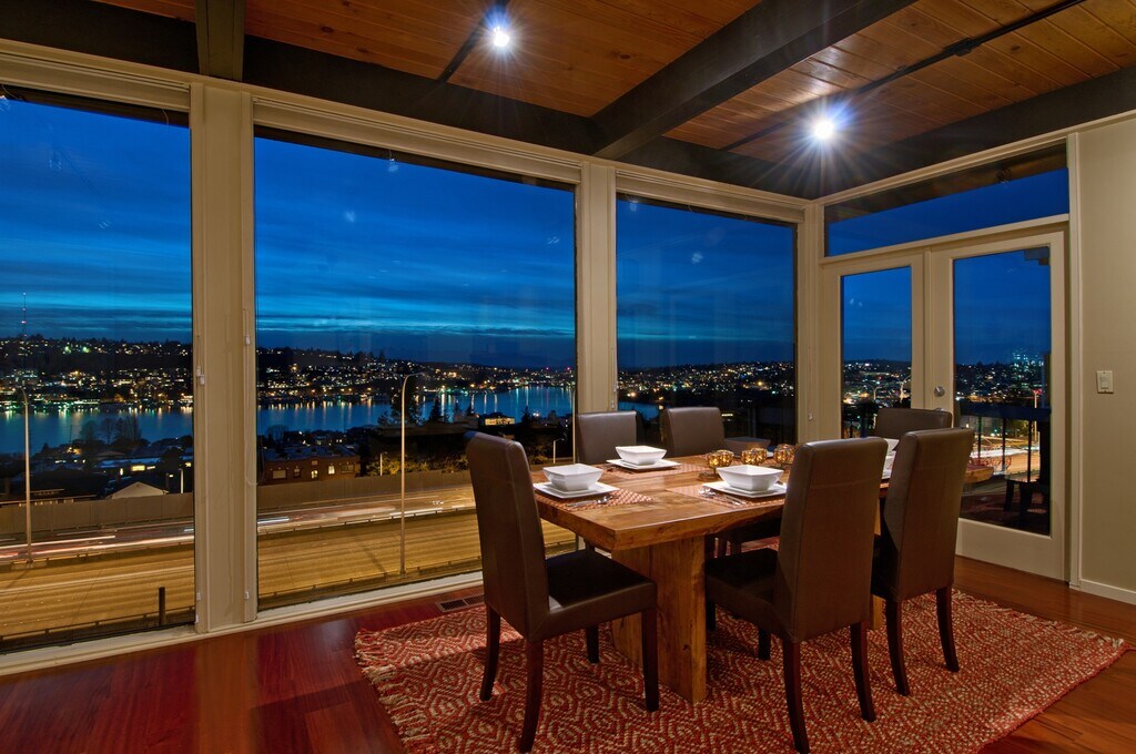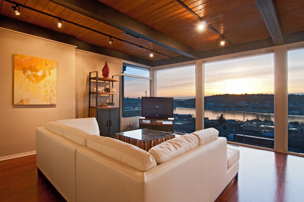 Medina Properties has been providing furnished accommodations to home remodel escapees, corporate and vacationing travelers for 20 years. Reviews provided upon request. Posted rate includes parking for one vehicle, utilities, w/s/g, landscaping and monthly housecleaning. We require a 30-night minimum stay. Longer terms are also available. We require a 760+ FICO and signed lease before your reservation can be confirmed by Medina Properties. All on one level, spacious, art-filled and exquisitely furnished 3 bedroom 2 bathroom penthouse in triplex with floor to ceiling windows overlooking 180 degree views of Olympic Mountains, Lake Union and Downtown Seattle. And you won't need to climb the stairs to the rooftop deck to enjoy the view 24/7! Some soaring 11' ceilings with skylights provide extra light and space in addition to windows and/or glass doors on all 4 sides. Watch seaplanes, crew races, fire boats, duck dodge, 4th of July fireworks as well as New Year's Eve fireworks from the Space Needle. 2 huge decks surrounded by beautifully landscaped grounds. 1580 sq. ft. of indoor living space, 350 sq. ft. of outdoor living space. Stainless appliances, Viking range and hood, Tigerwood floors, granite, travertine and marble throughout. Washer & Dryer in unit with lots of storage and huge closets. Three Mitsubishi heat pumps with AC for year-round comfort. Centrally located for easy access to I-5, I-90, South Lake Union, Amazon, The Gates Foundation, Microsoft, Seattle Cancer Care Alliance, Bertschi, Lowell and TOPS Elementary Schools. Seattle Prep, Garfield, O'Dea and Holy Names High Schools. Seattle Central Community College, Seattle University and University Of Washington. Many restaurants, coffee shops, gastropubs within walking distance. Activities such as kayaking, paddle boarding, rowing are a few blocks away and the Burke Gilman Bike Trail is only 3 miles away.