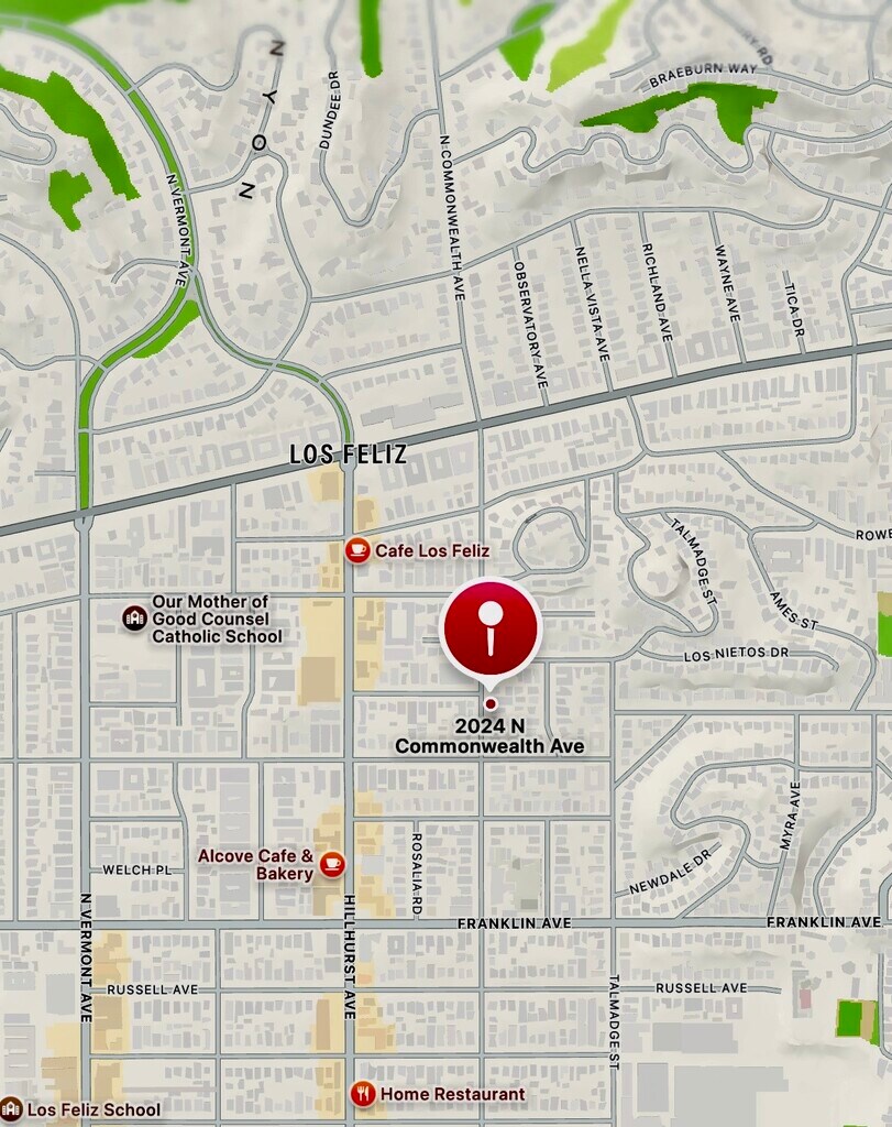 Está localizado en el barrio Los Feliz, 2028 N Commonwealth Ave en el código postal 90027 de Los Angeles, CA.