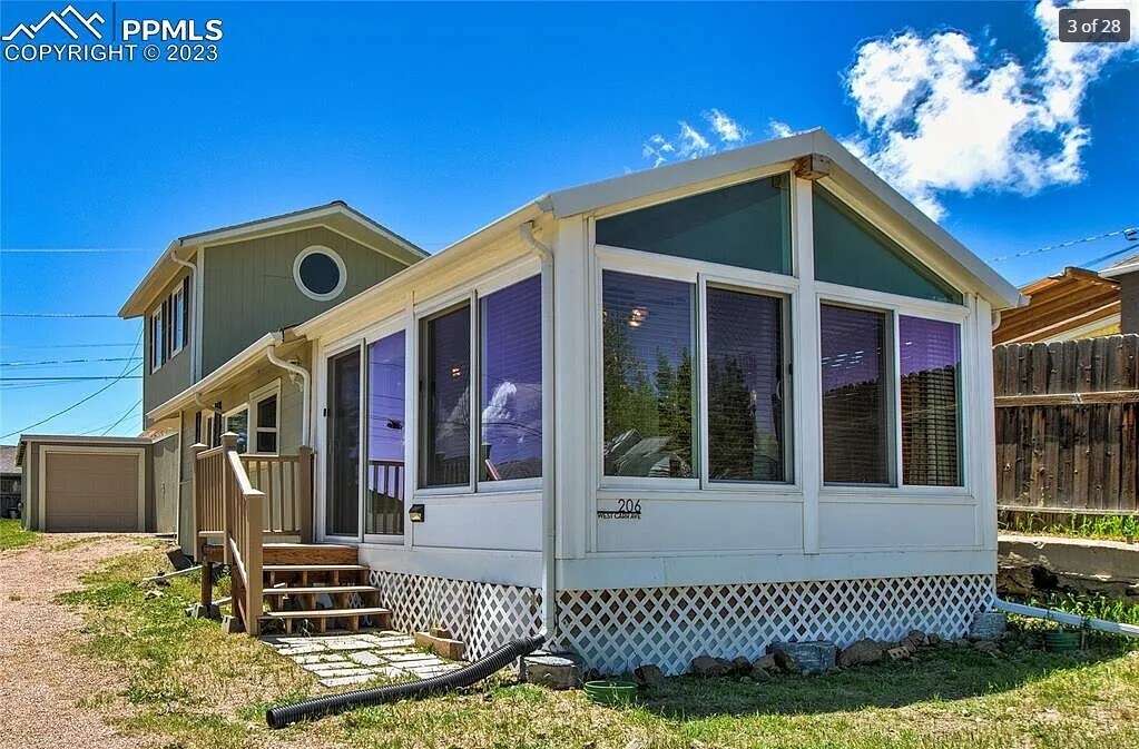 This house is just two blocks from the Chamonix Casino and Hotel, minutes from the Dollar Store and Grocery and Hardware store, and walking distance from the other casinos in Cripple Creek. The views from basically every room are incredible. There is one master bedroom upstairs, and a small bedroom downstairs. The sun room could also be converted into a bedroom. The wall furnace in the living room is gas fueled, and is the only heat source in the house. It is totally sufficient for the downstairs, but we tend to put individual electric (Dyson) heaters in the bedrooms and the sunroom for efficiency. There is one small full bathroom downstairs with a tub/shower. Water pressure is great. There is heat tape wrapped around the pipes under the house that protects the plumbing during the cold winter months. The kitchen is equipped with a refrigertor, oven/stovetop, and double sink with a brand new, 3/4 HP disposal system. The laundry area in the living room has a stacked washer and dryer, and space to store brooms, mops, and cleaning supplies. There is a one-car garage for your vehicle, with extra covered storage space next to the garage, and a patio outside the downstairs bedroom.