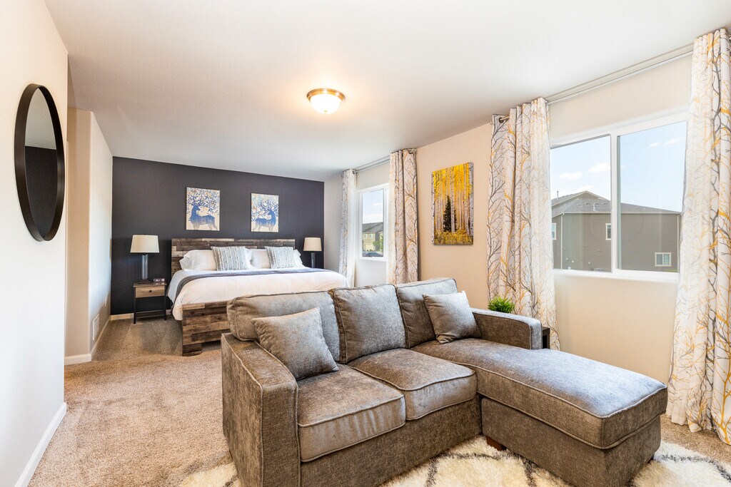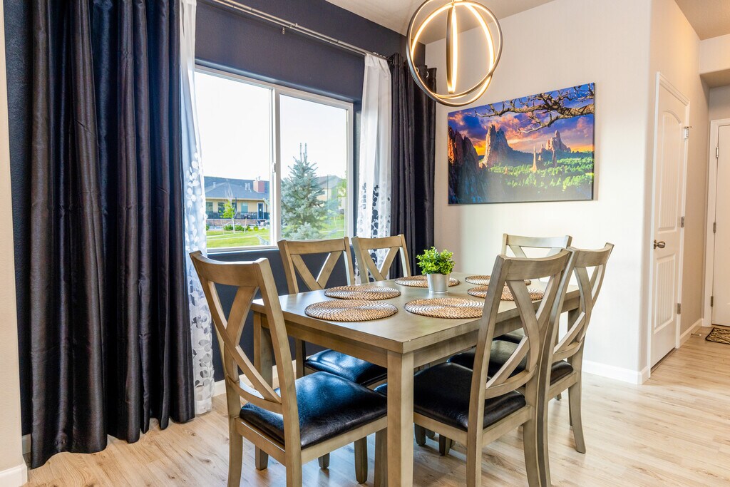 Beautiful, well maintained townhome in a newer neighborhood that is centrally located and close to Downtown and Fort Carson! This community includes a Clubhouse, Gym and a seasonal Pool & HotTub! The townhome is a spacious 3 Bedroom, 3 bathroom end unit with an Attached 2 Car Garage and an EV Charger! The views of Pikes Peak from the secondary bedrooms is stunning! The Primary Bedroom is a suite with space for an additional sitting room!