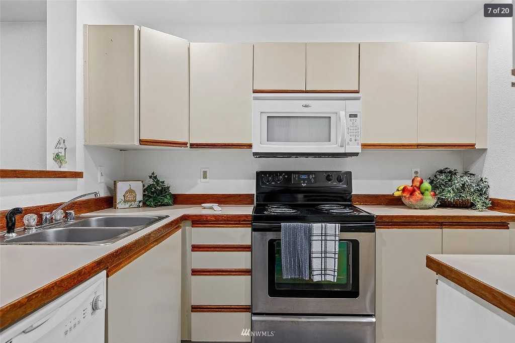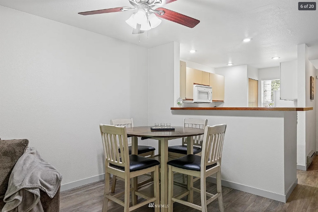 Welcome home to this move-in ready townhome! Spacious floor plan opens to your kitchen, dining and living room areas, leading to your private patio. Upper level offers two primary suites. Newer water heater and flooring in the main living area. Detached garage plus covered parking steps away from your front door are included with the condo. All appliances stay. Great location with easy access to the freeway and main roads, new bus and train terminal, Federal Way Commons and other amenities.