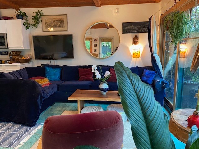 Charming Studio with Outdoor Oasis Discover tranquility in this thoughtfully renovated detached studio, tucked behind the main cottage. Soaring 14-foot wood-lined ceiling creates an airy, spacious feel in this unique home. Dedicated study with natural light, generous desk space, and shelving—is perfect for working from home or creative pursuits. Bathroom features a walk-in shower and premium Toto bidet toilet with heated seat. Ductless heating/AC system, plus additional AC unit in study, afford optimal comfort. Private clawfoot bathtub nestles under mature trees—your personal retreat for unwinding under the stars. There are relaxing outdoor spaces for morning coffee or evening contemplation. Convenient laundry shed with washer and dryer located just steps from the bathroom Situated in a peaceful, tree-lined neighborhood that offers the best of both worlds: quiet residential charm with easy access to shops, restaurants, and services. Ample on-street parking available. Ideal for professionals, creatives, or anyone seeking a peaceful sanctuary with modern conveniences and distinctive character.