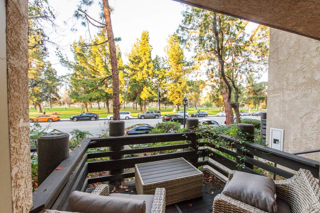 Welcome to this beautifully situated fully furnished 2-bedroom plus bonus room, 2.5-bath townhome, surrounded by lush greenery and offering stunning park views. With 1,526 square feet of thoughtfully designed living space, this home is truly an entertainer’s dream. An updated open-concept layout features recessed lighting throughout, three private patios, and beautifully appointed furnishings, creating a seamless blend of comfort, style, and indoor-outdoor living. The upgraded kitchen boasts stainless steel appliances and opens to a convenient office nook and adjacent patio—perfect for work or relaxation. Upstairs, you’ll find two spacious bedrooms. The primary suite features vaulted ceilings, a private balcony with park views, two closets including a walk-in closet, and an upgraded ensuite bathroom. The second bedroom also offers a walk-in closet and its own upgraded bathroom. The lower level provides a versatile bonus room ideal for a home office, movie theater, gym, or additional living space, along with a washer and dryer and direct access to a two-car garage. The HOA covers water, basic cable, and earthquake insurance. Residents enjoy an abundance of amenities, including walking paths, creeks, ponds, tennis courts, pools, spas, and recreation rooms. Ideally located just minutes from shopping, dining, and entertainment, this home offers the perfect balance of comfort and convenience