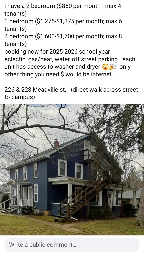 Actualmente hay un Casa de 4 Dormitorios 2 Baños en alquiler con 1,400 en 228 Meadville St. Está Disponible August 3, 2026.