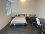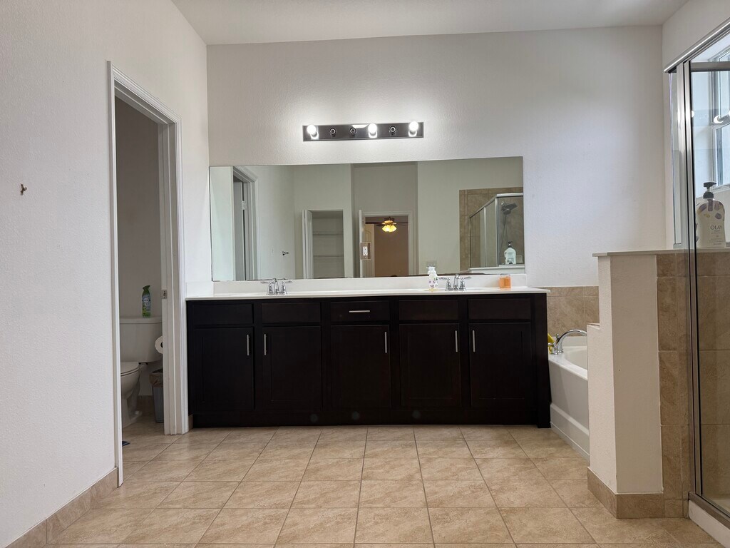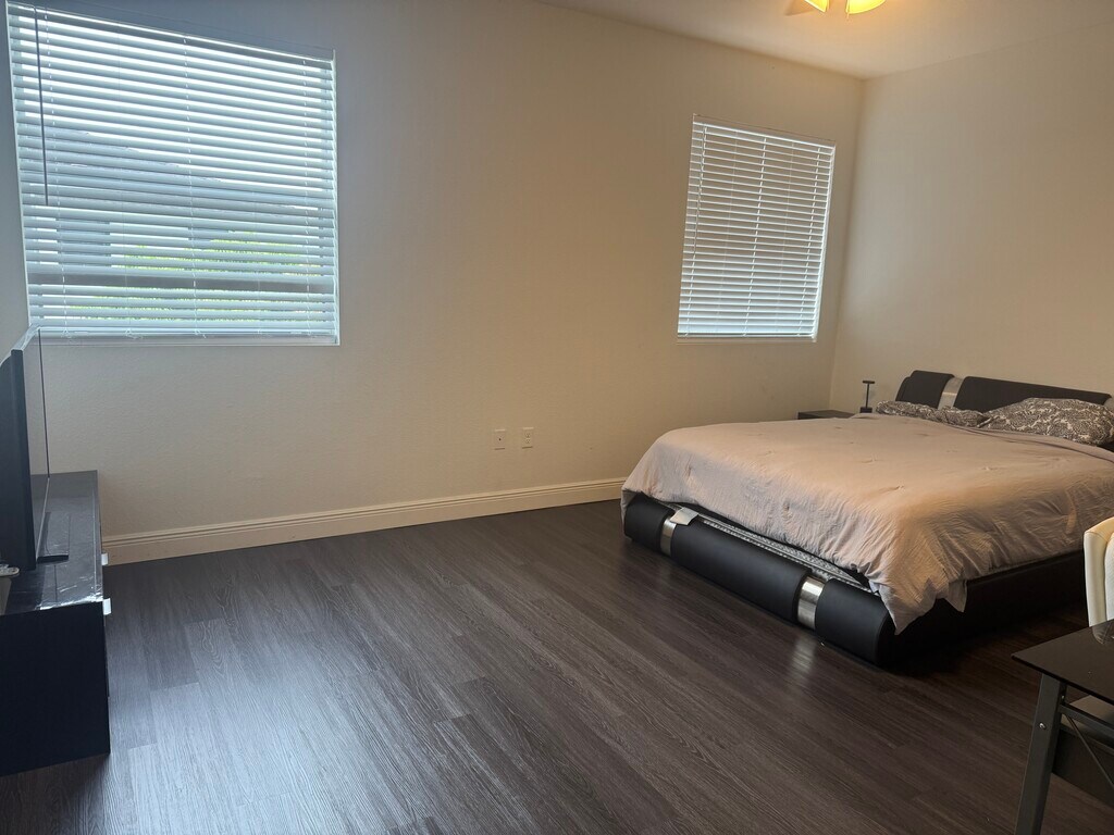 Private Fully furnished Primary Bedroom with Huge bathroom . Luxury laminate flooring with tile in bathroom . 2 hugh walk in closets and linen closet in bathroom. Full access to the kitchen and dining room and family room.