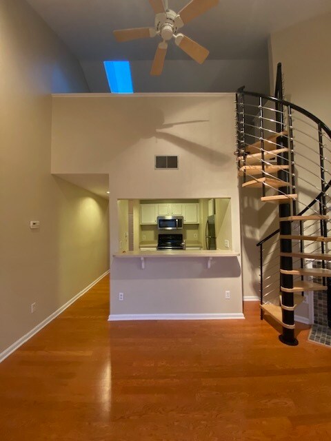 This 1-bedroom, 1-bathroom apartment at 230 S Cedar St offers 775 square feet of living space. The loft layout features an eye-catching spiral staircase up to the spacious flex space, perfect for a home office. Living space also includes a fireplace, providing an inviting area for relaxation. The kitchen is equipped with modern appliances and a dishwasher for convenience. Apartment also includes a washer and dryer for in-unit laundry. The bedroom is designed for comfort and privacy, while the bathroom is functional and well-appointed. Additional amenities include air conditioning and a smoke-free environment. The exterior of the property is well-maintained, and walkable to uptown, Southend, Wesley Heights and Frasier Park. Walking distance to Bank of America stadium for ease of access to games and concerts. Balcony provides panoramic skyline views. Rent is competitively priced to reflect the features and location. This property is ideal for those seeking a comfortable and practical living space.
