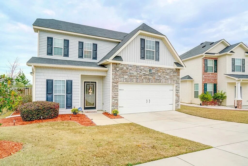 Welcome to this spacious, 3-bedroom, 2.5-bath home with an attached 2-car garage, offering 1,628 sq ft of comfortable living space in the highly desired High Meadows subdivision community of Grovetown, GA. This beautiful home is nestled in a quiet, well-kept neighborhood just minutes from I-20 and Fort Eisenhower, shopping, dining, and top-rated Columbia County schools. Offering a functional layout with comfortable living spaces, this property is perfect for anyone looking for both convenience and charm. The 2-car garage has surrounding stone accent. Walk in the home into the foyer that has hardwood vinyl. There is a half bathroom that is off of the foyer. There is a full bathroom upstairs for guests. The great room features an electric fireplace that has stone surrounding and wood hearth. The kitchen has stainless steel appliances, pantry, tile back splash around cook tops, and granite counter tops. All bedrooms upstairs and the great room have carpet. The laundry room is located upstairs for privacy. The master bedroom has tray ceilings with decorative trim. The master bath features dual vanity sinks, oversized soaker tub with tile surround back splash, separate stand up shower. The master bedroom has a walk-in closet. The spare bedrooms both have walk in closets. The backyard is completely landscaped and has a shadowbox privacy fence. There is also has a rear patio (10x15) that would be great for grilling. The attic has been boarded to increase storage space. Great to store military gear or those items needed only once a year. The smaller spare bedroom has attic storage space on both sides of the room with separate doors. Owner approved pets are a $150 one-time fee ($250 large dogs over 65lb) and additional $25 a month each. Two pets or less to include small dogs less than 50 pounds. Will show by appointment only.