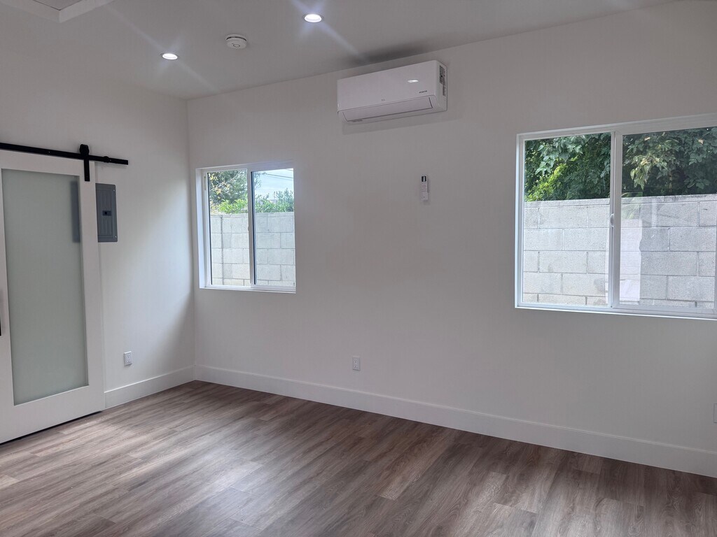 This is a brand new Single ADU in a quiet area of Burbank- close to all of the studios. This is newly built and has only 1 shared wall with the front house. There is a detached two story building at the rear of the property. The unit feature a mini-split for AC and heat, a great bathroom with a barn door, high ceilings and a kitchen with sink, refrigerator and stove.
