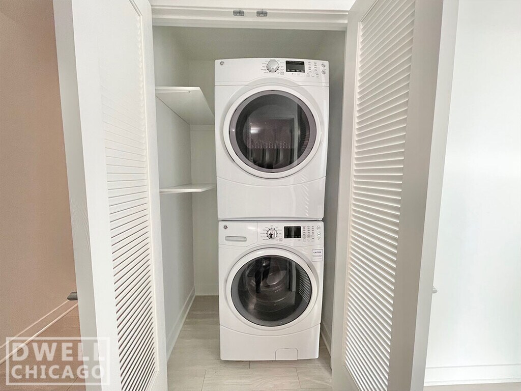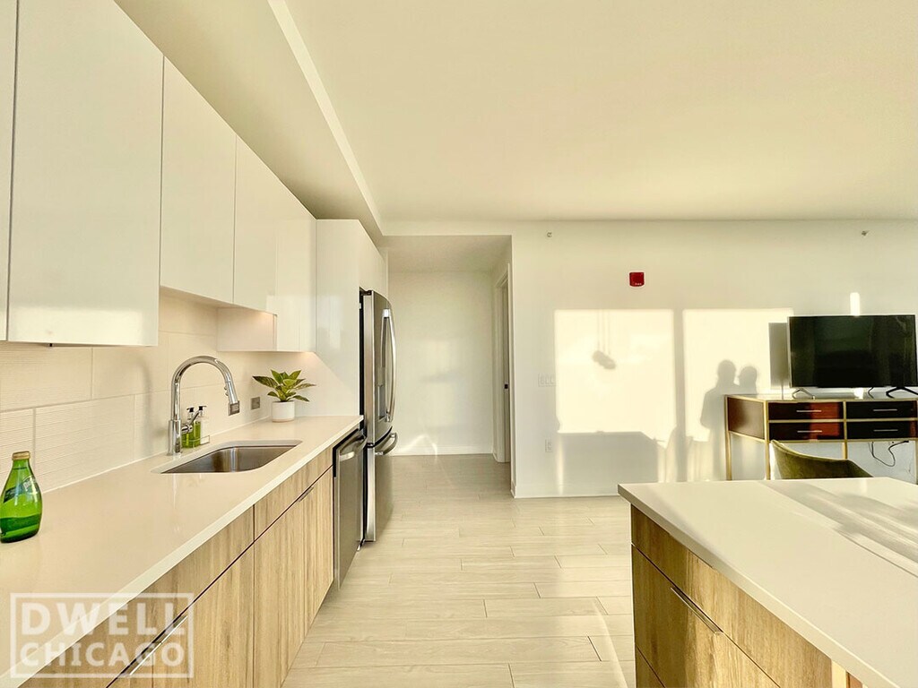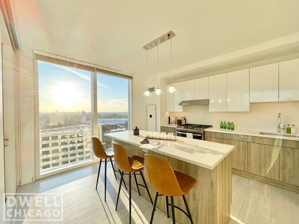 The apartments feature wide-plank flooring; floor-to-ceiling windows; solar shades; soft-close cabinetry with under-cabinet lighting; quartz countertops and tile backsplashes; stainless steel appliances; built-in kitchen islands; walk-in closets with built-in organization systems; walk-in showers; and in-unit washers and dryers. Building amenities include a fitness center and yoga studio; game room with arcade, shuffleboard and pool tables; sky lounge with entertainment kitchen; co-working lounge; rooftop pool, hot tub, sundeck, and dining area with seating and built-in grills; pet spa and owner’s lounge; private dog run; children’s playground; bicycle storage; on-site parking garage for residents and guests; hotel-style concierge services and 24/7 attended lobby; dry cleaning pick-up/drop-off service; automated package lockers with cold storage for grocery and flower deliveries; complimentary coffee bar; and on-site maintenance and management.