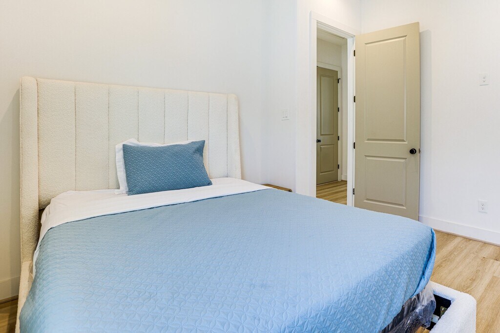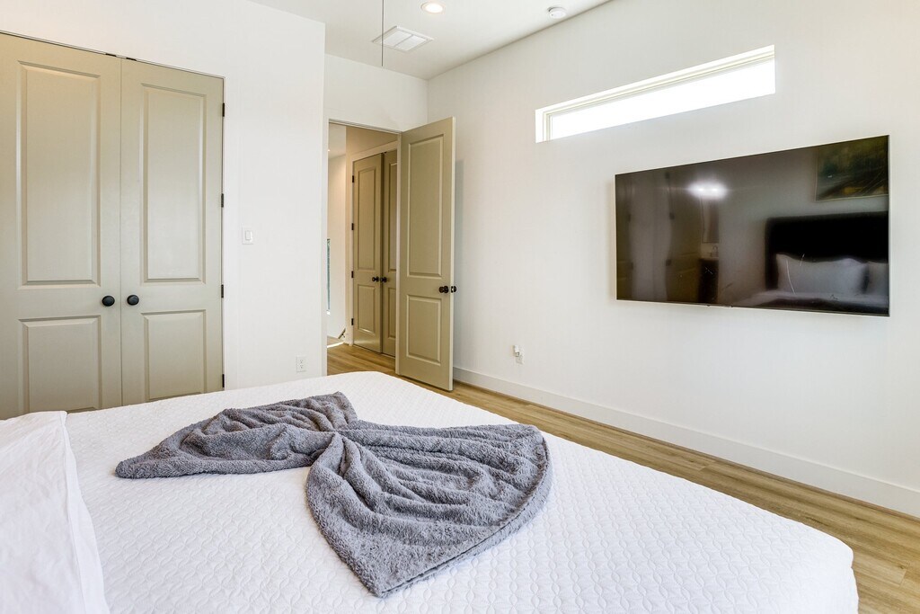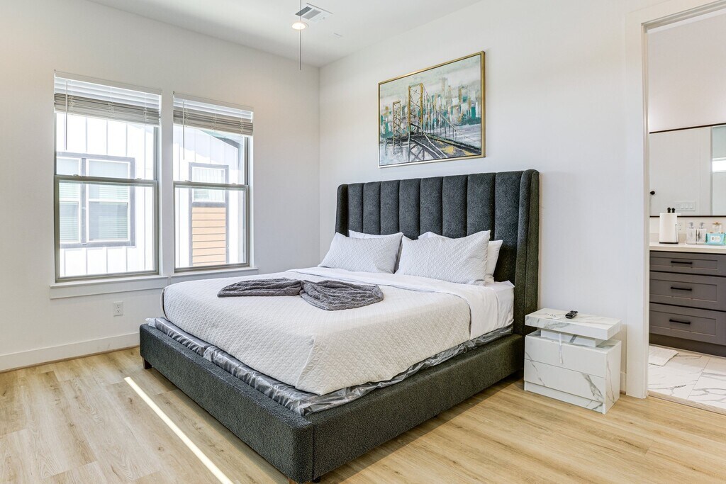 Furnished 3-Story 3BR/3.5BA Townhome Near Medical Center & Downtown – Modern + Private Baths | Remote Work Ready | Gated Community Stay in the loop — where business, bites, and Bayou trails are all within reach! This 3-bedroom, 3.5-bath modern 3-story townhome is your spacious launchpad to H-Town's highlights, including the Texas Medical Center, Downtown, Midtown, U of H, and Museum District. Perfect for medical professionals, graduate students, corporate renters, and traveling teams needing immediate, turn-key housing. The home includes all furnishings, a modern kitchen, an attached 2-car garage, a full-size washer/dryer, and private ensuite bathrooms in every bedroom. Make Houston easy, start from here - just bring your suitcase! Pet-Friendly: Yes — dogs & cats welcome. Contact for pet-policy details (pet fee, deposit, and pet rent apply). The Space BEDROOMS - Bedroom 1: 1 king bed - Bedroom 2: 1 queen bed - Bedroom 3: 1 full bed TOWNHOME HIGHLIGHTS - Fully furnished (living room, dining, kitchen, bedrooms, décor) - 3 private bedrooms — each with its own full ensuite bathroom - 3.5 bathrooms total - Modern kitchen with stainless-steel appliances - Quartz countertops & breakfast bar - Full-size washer & dryer (in-unit) - High-speed WiFi ready - Smart TVs included - Balcony + natural light - Smart TVs, - Electric fireplace - Attached 2-car garage - Keyless entry - Central AC/Heat KITCHEN - Refrigerator, stove/oven, dishwasher - Drip coffee maker - Toaster, microwave - Cooking basics, dishware & flatware GENERAL - Free WiFi (800 Mbps) - Central A/C & heating - Iron & board - Linens & towels FAQ - 2 exterior security cameras (facing out) - No smoking ACCESSIBILITY - Multi-level townhome, step-free entry - Bedroom & bathroom on lower floor - Interior stairs required to access living room & kitchen PARKING - Garage (1 large vehicle or 2 compact vehicles) - No parking in front of the townhome - Free street parking (first-come, first-served) Access Access to the entire property via keyless entry Location Benefits 4 minutes to TMC hospitals Walkable to parks, cafes, and new developments Quick commute to MidTown, Downtown, and Eado Quiet residential street Pet Policy Pet-friendly — dogs & cats welcome One-time pet fee, refundable deposit & monthly pet rent apply Contact for details