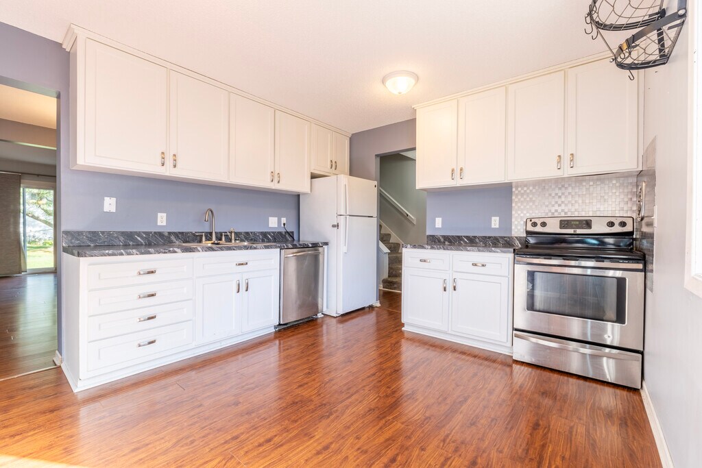 Kitchen and both bathrooms have been remodeled with high end cabinets, soft close doors and drawers. Hard surface flooring in living room, kitchen, hallways. Lots of storage and a tuck under one car garage. Very pleasant space. Exterior new last year. This place is very efficient. Low gas and electric bills. A playground just a few steps away from your front door.