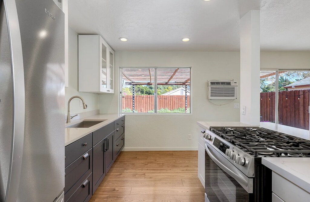Front home features 3 bedrooms and 2 full bathrooms, along with a remodeled kitchen showcasing quartz countertops, upgraded cabinets, pergo flooring, and a deep farmhouse sink. The home offers 1,254 sq. ft. of living space, plus a private and spacious backyard with a covered patio, fruit trees, lifetime sheds, and wall A/Cs. The 2-car garage has been converted into two separate rooms, offering approximately 420 additional sq. ft. of flexible space that can be used as an extra bedroom, office, or storage. Washer, dryer, and refrigerator are included. Driveway parking is shared with the back unit. Conveniently located next door to beautiful Berry St. Park.