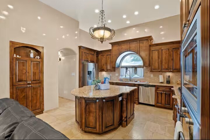 Absolutely stunning Tuscan North Valley gem tucked away just off Rio Grande Blvd, minutes to Old Town, Downtown, and the Sawmill District, with quick access to I-40 and I-25. This custom 2,677 sq ft, 3 bedroom, 2.5 bathroom home, with a downstairs flexible room/office that can function as a 4th bedroom, offers high-end finishes rarely found in rental properties, including diamond (Venetian) plaster walls, solid wood doors and arch doorways, travertine tile, a dramatic wrought iron staircase, and upgraded lighting throughout. The chef's kitchen features custom alderwood cabinetry, granite countertops, stainless appliances, a gas cooktop, and a large island open to the main living area, ideal for entertaining or everyday comfort. The spacious floorplan includes multiple living areas and an upstairs loft with seasonal Sandia Mountain views, and during other times of year, enjoy lush green tree views. The spacious primary suite is located on one side of the home for added privacy. The primary bathroom features a jacuzzi tub, custom tilework in the big shower, and a walk-in closet. An additional large luxury bathroom, located between the two secondary bedrooms, includes dual sinks, generous cabinet storage, and a custom arched tile shower. Refrigerated central air (NOT swamp cooler), and central heat with two units allow separate climate control for each side of the home. The laundry room offers extensive cabinetry, a utility sink, and granite countertop space. Attached 2-car garage with remote access. A rare opportunity to enjoy luxury, comfort, and convenience all in one place. -Tenant pays for all utilities and yard maintenance. Owner provides routine pest control service and HVAC filter changes. -No smoking permitted inside the home. A remediation fee will apply for any evidence of smoking. -One-year lease; fully furnished requests will be considered. -Pets considered with approval and additional deposit. -$40 per adult tenant screening required. -Located on a shared property, in between two architecturally similar custom homes.