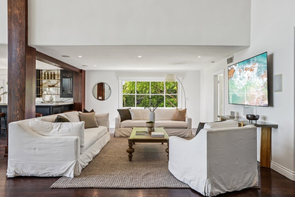 Perched at the Summit of Mount Olympus and tucked away at the end of a peaceful cul-de-sac, this extraordinary 5-bed/5-bath estate, including an office and a detached guesthouse offers an unparalleled blend of luxury, privacy, and breathtaking views. A true entertainer's dream, this Contemporary Mediterranean masterpiece is thoughtfully designed to capture the essence of California living. Step into the expansive Great Room, where 20-foot soaring ceilings, rich hardwood floors, an elegant fireplace, and grand Palladian windows frame sweeping views of the city, canyon, and ocean beyond. Whether hosting formal gatherings or relaxing with loved ones, the space seamlessly combines comfort and sophistication. The Gourmet Chef's Kitchen is equally impressive featuring custom wood cabinetry, granite countertops, a generous center island, and a full suite of top-tier Viking appliances, including a full-height wine refrigerator. A built-in Miele espresso machine ensures your mornings are as refined as your evenings. The formal dining room and adjacent breakfast area offer elegant spaces for every occasion. This home boasts two expansive master suites, each offering a private sitting area, spa-inspired en suite bath, and serene balconies. Outside, a true oasis awaits. The meticulously landscaped backyard is a private retreat, reminiscent of the world's most luxurious resorts. Lush gardens envelop a resort-style pool with spa and cascading waterfalls, creating a serene ambiance perfect for relaxation or entertaining. With its seamless indoor-outdoor flow, smart technology, guest accommodations, and dramatic panoramic vistas, this rare offering defines high-style living. Sophisticated yet welcoming, this home is the ultimate Southern California sanctuary. Offered as the quintessential retreat for those seeking privacy, elegance, and inspiration at every turn.