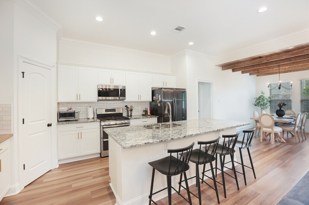 Stunning three-bedroom, two full bathroom home featuring an open, split floor plan. The kitchen offers granite countertops, a gas stove, stainless steel appliances, tile backsplash, kitchen island, walk-in pantry, and an eat-at bar that opens to the main living areas. The primary suite includes a private water closet, double vanity, garden tub, separate shower, and a walk-in closet with direct access to the laundry room. Additional features include a mudroom with boot bench, recessed can lighting in the kitchen, crown molding, a beautiful wood-accent ceiling in the dining area, and luxury vinyl plank flooring throughout the living room, hallways, and all wet areas. Enjoy the covered rear patio and fully fenced backyard. The home also includes a WiFi-enabled thermostat. No pets allowed. Twelve-month lease required.