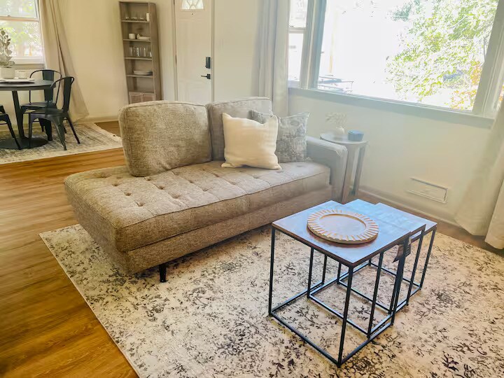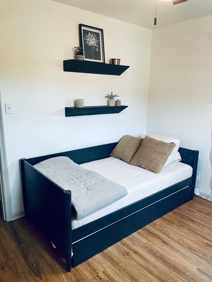 Newly Renovated, Fully Furnished Upper Main Floor of a Duplex with 2 Private Entrances. Short term or long term lease options. Utilities included in the monthly rent price listed. Located in a quiet neighborhood on Colorado Springs' west side, only a short walk away from the many shops and restaurants in Old Colorado City. Also, very close to downtown, Manitou Springs, and Garden of the Gods. Includes: 2 bed/1 bath, washer/dryer, full kitchen, dining area, WiFi, smart TV, AC, deck, fenced-in backyard, and off-street parking. Every room in the house has been recently remodeled for a warm, updated look. This upper duplex has all new finishes and is professionally designed! Come make yourself at home and explore the best of the city with downtown, Old Colorado City, and Garden of the Gods nearby. Take a quick trip to Manitou or head north to the Air Force Academy. Enjoy the mountain views off the back deck while you sip your morning coffee. The layout: -Walk into the open layout living room/dining/kitchen -A small hallway leads to three doors: the bathroom, a bedroom with a Queen bed, and second bedroom with a trundle bed (two twins) that doubles as an office. The office space is only distinct for working professionals as opposed to families who will need to use it as a bedroom instead! -There are a total of 3 AC units and 4 ceiling fans to keep you comfortable during the summer months! One in each bedroom and one in the main living area.
