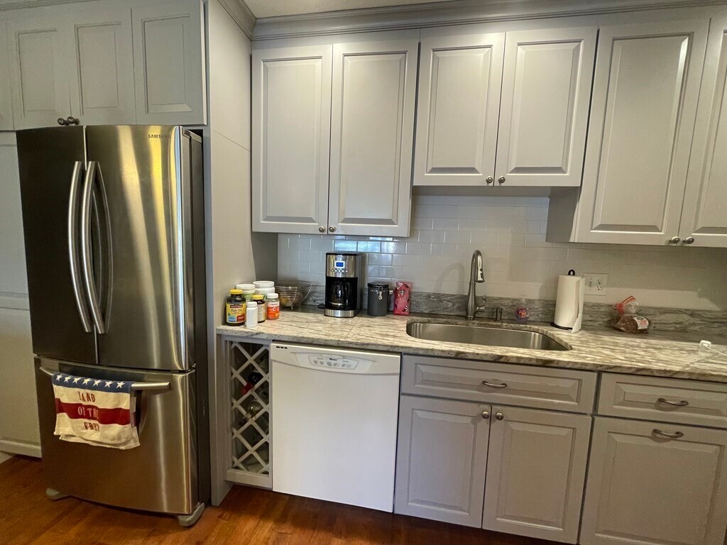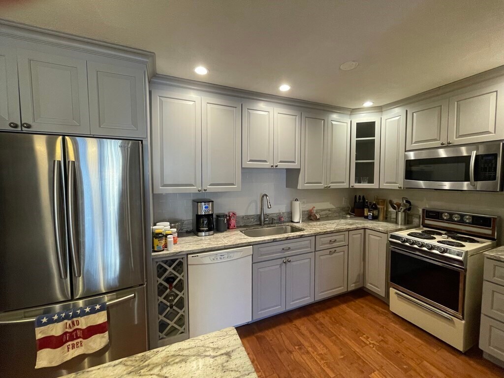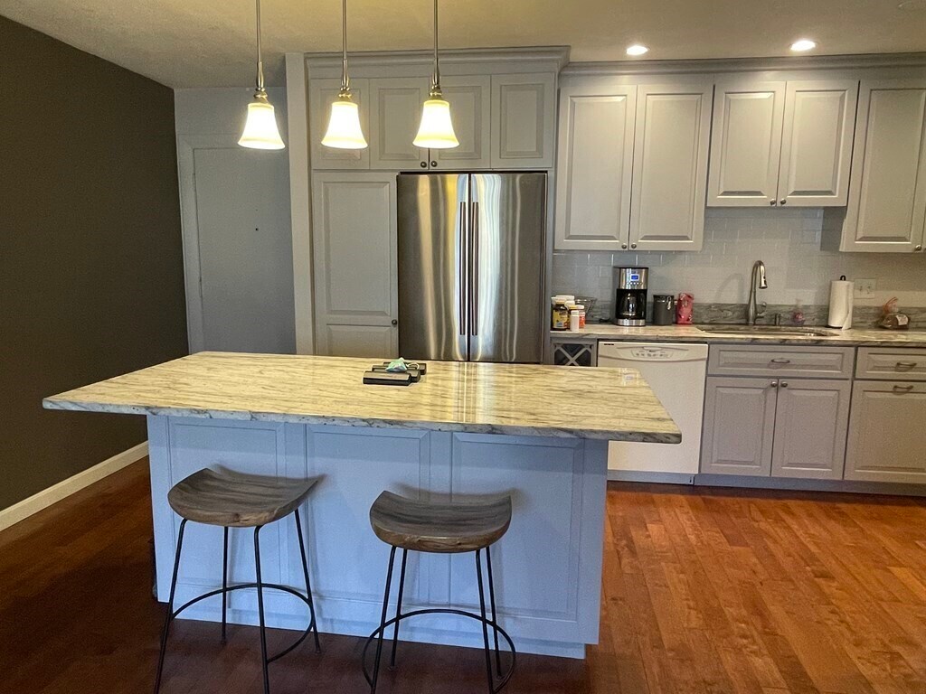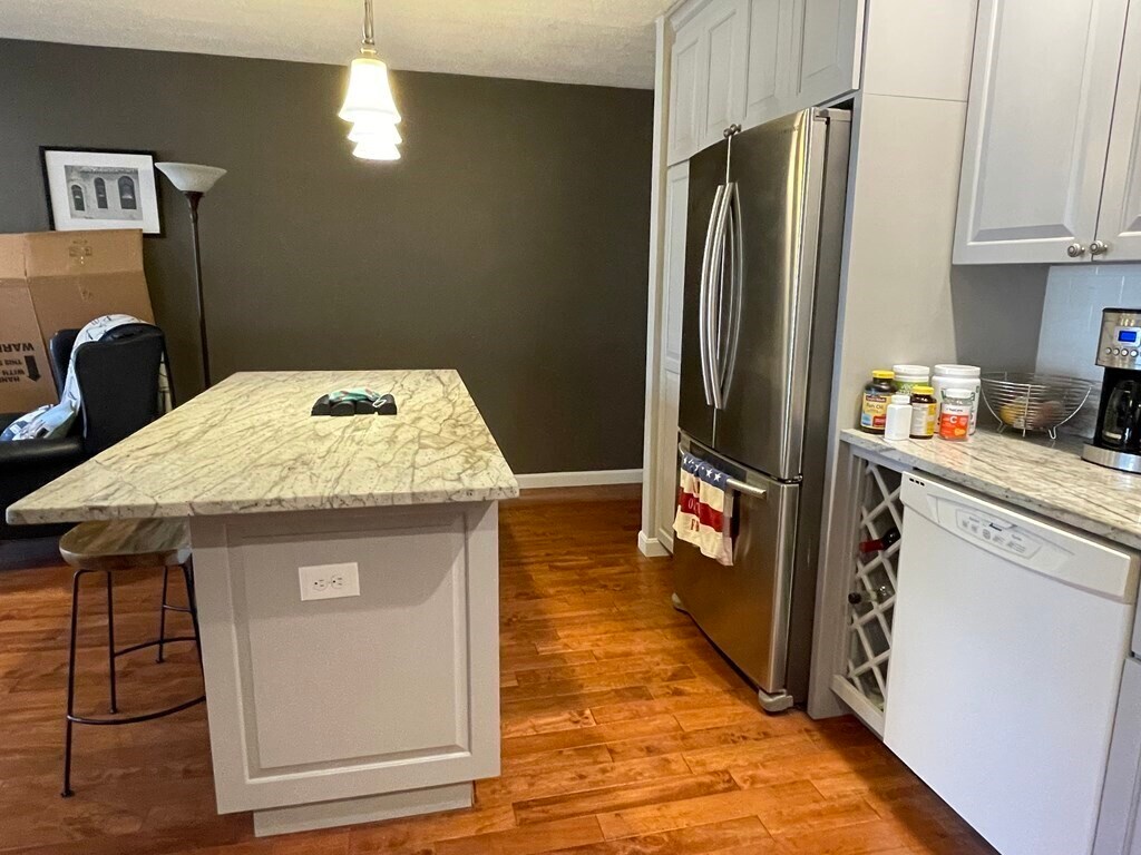 Convenient location close to shopping, parks and transportation. Bright 1 bed with a private balcony, wood floors throughout, open kitchen/living room layout separated by an island with overhang for stools. The kitchen features granite countertops, pendant lights, wine storage, stainless double door fridge, dishwasher and ample cabinet storage. Spacious bedroom with a large closet and huge window. The bath has a tub with shower head, tile floor and a separate linen closet in the hall. Common laundry in the basement. One parking spot available for $100/mo.