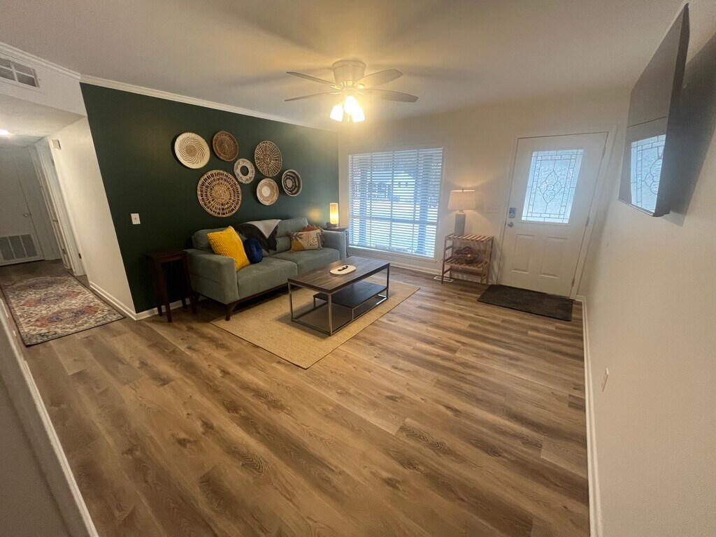 ¡Bienvenido a su hogar en este impresionante hogar recientemente renovado a sólo pasos del Truist Park! La casa incluye dos salas de estar, ambas con televisores montados. Junto a la sala de estar se encuentra la cocina recientemente pintada con encimeras de granito. La cocina viene equipada con todos los elementos esenciales. Fuera de la cocina hay una lavandería con electrodomésticos nuevos. En la parte trasera de la casa hay una ENORME suite principal con baño privado en suite. Cuatro armarios y un vestidor ofrecen mucho espacio de almacenamiento. La habitación está completamente amueblada e incluye una cama King y escritorio. El amplio baño privado fue renovado recientemente. En el otro lado de la casa, hay tres dormitorios adicionales, uno con baño privado. Los otros dos dormitorios comparten un baño de salón. La casa se encuentra a sólo minutos de muchos de los hospitales y centros tecnológicos de Atlanta. A menos de 5 minutos en coche de tiendas, Costco, Cumberland Mall y una gran variedad de restaurantes. El aeropuerto se encuentra a unos 30 minutos en coche, dependiendo del tráfico. Y no olvide caminar para ver un partido de los Atlanta Braves durante la temporada. Los servicios públicos están incluidos hasta 75 USD por persona (incluido Internet de fibra AT&T).