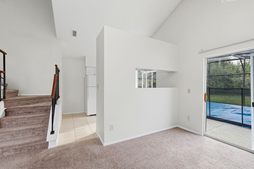 A generous layout, vaulted ceilings, and a peaceful setting come together to create a comfortable backdrop for daily living in this 3-bedroom, 2-bath home. Your primary living area offers flexibility for both everyday routines and relaxed downtime, with carpeted floors and sliding glass doors that lead directly to the backyard. The dining area sits comfortably within the same open volume, making the space easy to furnish and adapt. Just beyond, the kitchen provides generous cabinetry, expansive counter surfaces, a double sink positioned under a large window, and essential appliances arranged for practical use, all framed by durable tile flooring. Outside, the large private lot opens to a wooded conservation area at the rear, creating a peaceful backdrop with no direct neighbors behind you. Located within a well-kept subdivision, the home sits in a quiet, secluded area yet remains just a two-minute walk from the community basketball courts, and clubhouse. Everyday conveniences are close by, including Publix, ALDI, Walmart Supercenter, and shopping and dining at The Loop. Nearby Shingle Creek Regional Park offers trails and green space for outdoor recreation. *Our homes come as-is with all essentials in working order. Want upgrades? Request it through the Belong app, and our trusted pros will take care of the rest! Lease Term: 12 - 36 Months Available: Immediately Deposit Amount: one month rent Included in Rent: Trash This home is managed by Belong. Belong offers a new kind of rental experience with 24/7 support, concierge service, and an app to pay rent and report repairs. To schedule tours or apply for this home, reach out directly through the Belong website!