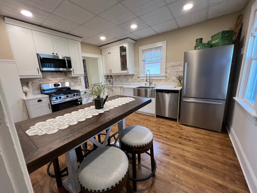 Absolutely gorgeous remodel. 2 bedroom 1 full bathroom home. 720 sq ft. Completely remodeled from head to toe. New roof, new windows, brand new kitchen cabinets, glass shelving as well as high-end Quartz countertops. Perfect high-top table and pub stools compliment this updated, bright looking kitchen. Kitchen also boasts a tin ceiling look and new lighting. All brand new stainless steel appliances, also includes a built in large microwave over the new gas stove. Home also has a new refrigerator and dishwasher. The brand new bathroom features a roomy tub and shower and plenty of storage under the modern farmhouse vanity. Take a look and the beautiful, refinished original Maple and Douglas Fir Floors. The home also has a brand new 6’ fence in the back yard. The home is privately fenced in from all neighbors. Please note that the back yard is open to the driveway, so children and animals are not completely fenced in. Sit on your covered front porch and enjoy a relaxing cup of coffee. The home also has a 1 car garage with a brand new garage door. The basement is clean and open, offers tons of storage and also features a brand new Washer and brand new Dryer. The entire home has a warm, welcoming feeling with fresh paint throughout. Take a look at the high trim, doors and moldings that are original to this home as well as the original cast-iron vents that show the true character of this home. Be the first family to live in this newly remodeled home. A Pre-Showing Questionnaire must be filled out prior to any scheduled showing. We do not accept state housing assistance. If interested, please request a link to the Pre-Showing Questionnaire. $1,850 monthly rent amount, $1,850 security deposit. Would consider small dog upon approval and conditions. $75 a month per small dog. Tenant to pay for all utilities as well as lawn and snow maintenance.
