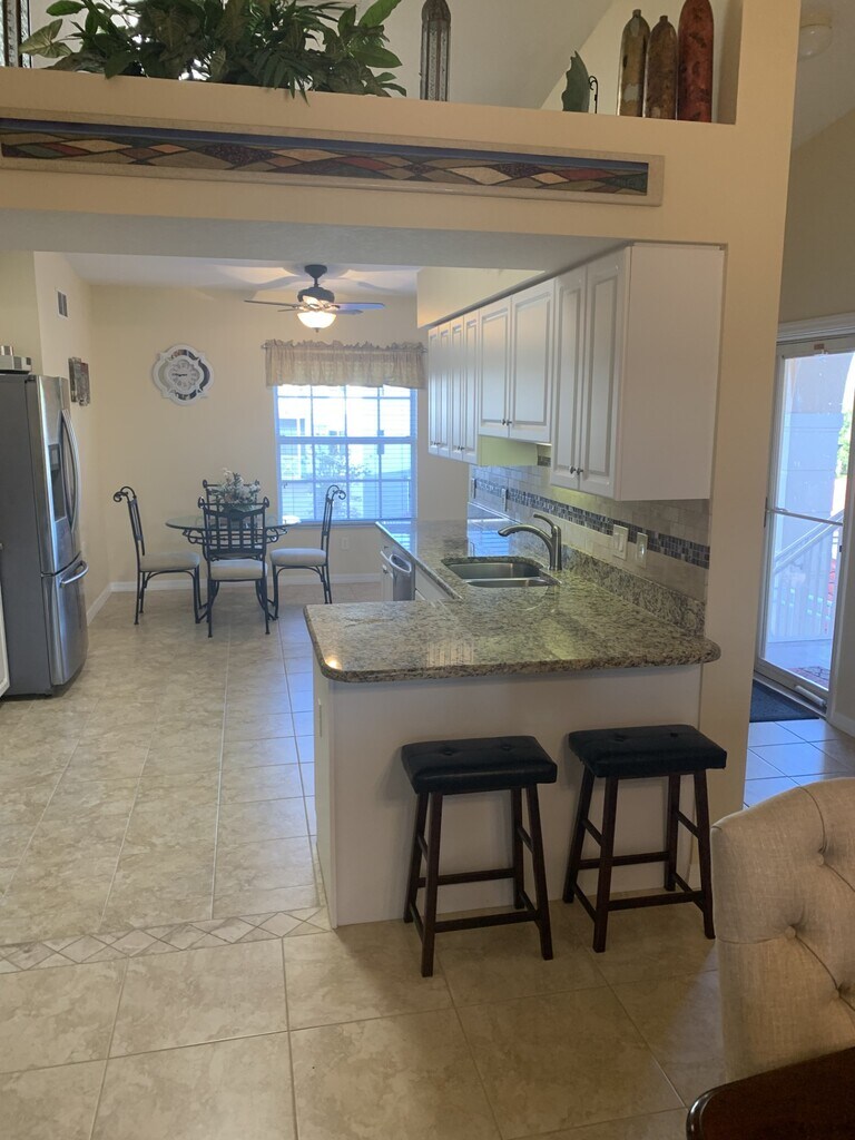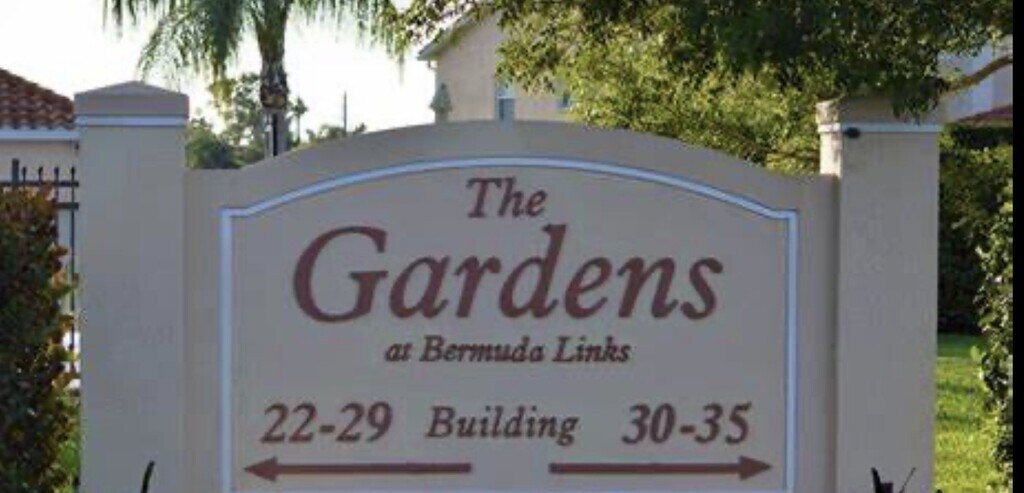 If you are looking for a beautiful, tropical paradise, this property is for you! Tastefully furnished, two bedroom with den or third bedroom and two full bathrooms, this 1,688 sq ft condo is immaculate. It boasts a spacious screened in lanai with scenic water views and vaulted ceilings throughout. The eat in kitchen comes with granite and stainless-steel appliances with a large pantry. The bathrooms are also granite and the en suite features a large soaking tub along with an oversized stand up shower and double sink. The laundry room comes with washer and dryer and plenty of storage, along with counter space for folding. This top floor, end unit has additional windows that let in an abundance of natural light and is tiled throughout. The building is three floors and includes an elevator. The detached garage has attic space for additional storage and there is extra parking in the lot. This gated community has so much to offer. As a renter in the Gardens community, you will have access to two private pools as well as the main pool. The clubhouse includes a large gym/exercise room, tennis courts, pickle ball, bocce courts and shuffleboard. There is also basketball, billiards, and a library. There is also space available for grilling and hosting events in a large community room with a kitchen. This condo association is situated on a beautiful public golf course that is pay to play.