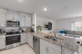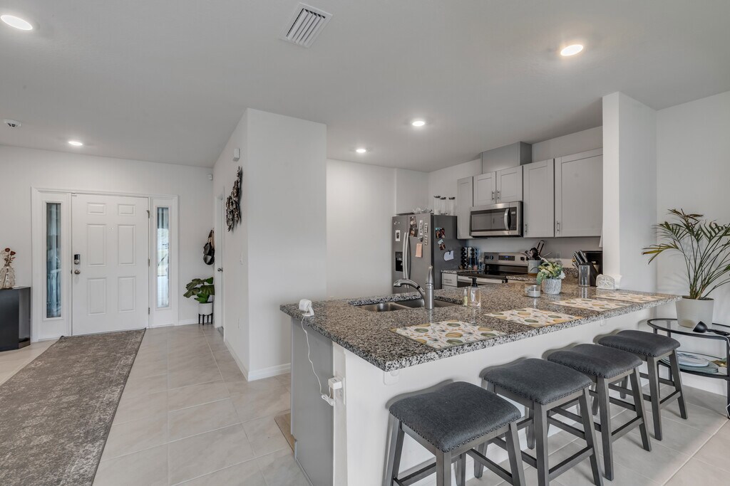 Welcome to 2724 Silver Canoe, a beautifully designed waterfront two-story smart townhome offering 3 bedrooms and 2.5 baths in the newer Rivers Edge community. Built by DR Horton in 2024, this concrete block residence blends modern design, functionality, and low-maintenance living. A generous foyer opens into a bright open-concept floor plan featuring a spacious kitchen with bar seating that seamlessly connects to the dining and living areas. Sliding glass doors lead to a charming patio overlooking a tranquil pond, creating the perfect setting for morning coffee or evening relaxation. Known as The Seabreeze model, this layout offers first-floor living with all bedrooms thoughtfully positioned upstairs. The kitchen is well-appointed with upgraded stainless steel appliances, solid stone countertops, and an efficient, user-friendly design ideal for everyday living and entertaining. Additional first-floor highlights include a powder room and single-car garage conveniently located at the rear of the home. Upstairs, the owners suite impresses with a walk-in closet, dual-sink vanity, and a spacious walk-in shower. Two guest bedrooms, a full bath, and a dedicated laundry room complete the second level. As part of the Rivers Edge community, this home includes Home Is Connected smart home technology, allowing you to control key features of the home from your smart device whether you're near or away. Community amenities include a sparkling pool with cabana, and is conveniently located near local dining and shopping, just minutes to I-95, and only a short drive to the salt air beaches of the Atlantic Ocean and charming New Smyrna Beach. With attractive curb appeal, modern construction, and move-in-ready convenience, this townhome offers the perfect balance of comfort, location, and lifestyle. Schedule your private showing today and make 2724 Silver Canoe your next home.