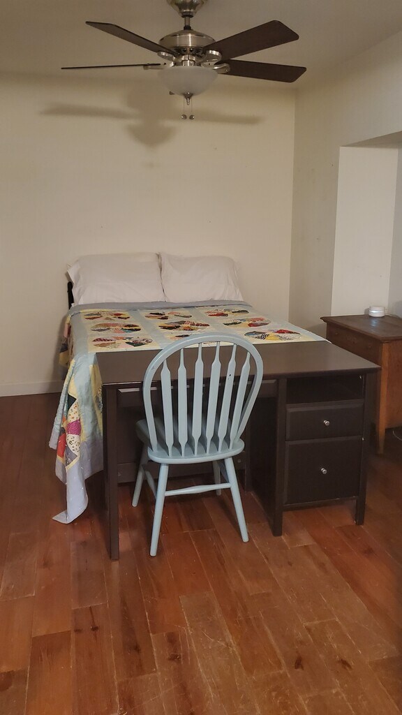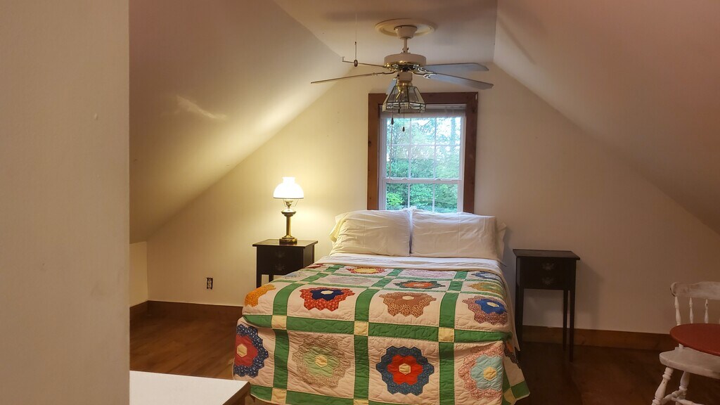 This furnished two-story cottage features a bedroom and full bathroom on each floor. The living room offers ample space for relaxation and is equipped with ceiling fans for comfort. The floors are hardwood and ceramic tile. There is on-demand hot water. The kitchen has a gas stove, and the laundry room provides a full-size washer & dryer. Additional amenities include a handicapped-accessible shower on the first floor and handrails for safety. The exterior of the property is well-maintained, providing a welcoming entrance with patio, table & chairs. The cottage is located on a 10=acre organic farm.