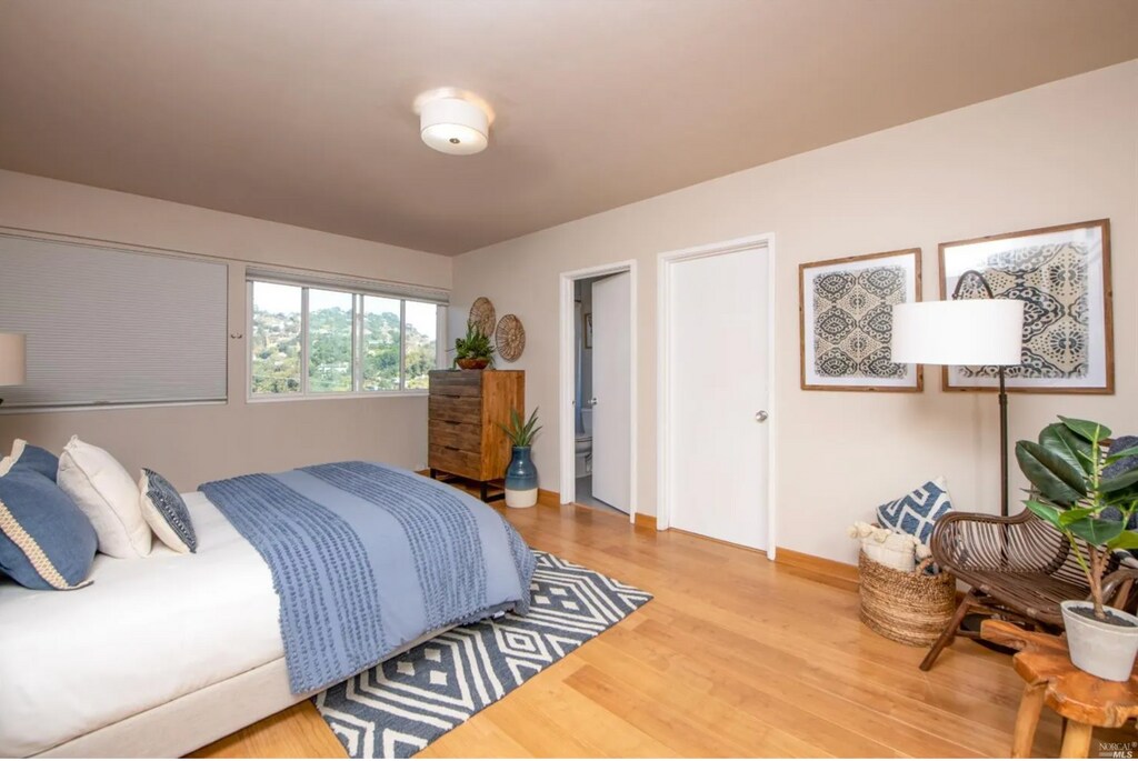 Top floor, end unit with great natural light and privacy. Restaurants, supermarket (Mollie Stone), a beautiful walking trail, Marin General Hospital, Larkspur ferry, Marin Country Mart, a public dock etc are all within walking distance on a bike/walk path. Elevator or stairs up to the 3rd floor. All three bedrooms have mirrored closet doors. Both bathrooms have a bathtub. Master bedroom has a walk-in closet. Large, private patio out back connects two sets of sliding glass doors to living room and middle bedroom. Above average amount of storage in the kitchen. The pool is open through September/mid-October. Corner-unit that only has shared walls with the stairwell and downstairs unit. One covered parking space behind the building. Street parking is easy for additional vehicles. App-operated laundry and trash chute one door away on the same floor, hallway is roof-covered (no getting wet in rain when doing laundry). Cats ok. If no pet, then unit can come with some living room and kitchen furnishings. Available June 1st or later, possibly a week or two earlier. All utilities covered by tenant except for garbage and water. 1-year lease. Please respond with information about your situation, when you're looking to move, and how many occupants. Application will include a $45 credit/background check, proof of income, and references from past landlords. Move-in cost will include the first month’s rent, a two-month refundable security deposit, and proof of renters insurance.