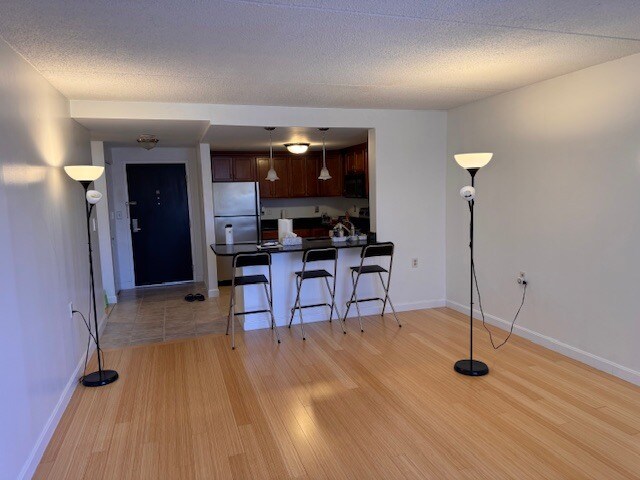 Welcome to this beautifully appointed top-floor, corner one-bedroom in the sought-after Stone Gables community. Step into an open-concept layout featuring an updated kitchen with stainless steel appliances, a brand-new dishwasher, and breakfast bar seating highlighted by modern lighting. The spacious living area boasts wall-to-wall hardwood floors and abundant natural light. The unit offers exceptional storage with multiple closets, including a walk-in. The updated bathroom features a full-size vanity with granite countertops. The generously sized bedroom comfortably accommodates a king-size bed set and includes hardwood flooring and a walk-in closet. A common laundry room is on the same floor as the apartment. Residents enjoy access to a gym, seasonal pool, and expansive outdoor green space with a nearby baseball field. The professionally managed building includes snow removal and landscaping. Ideally located just one mile from Malden Center, the T, I-93, grocery stores, restaurants, and more. One parking space included. Available March 1st 2026