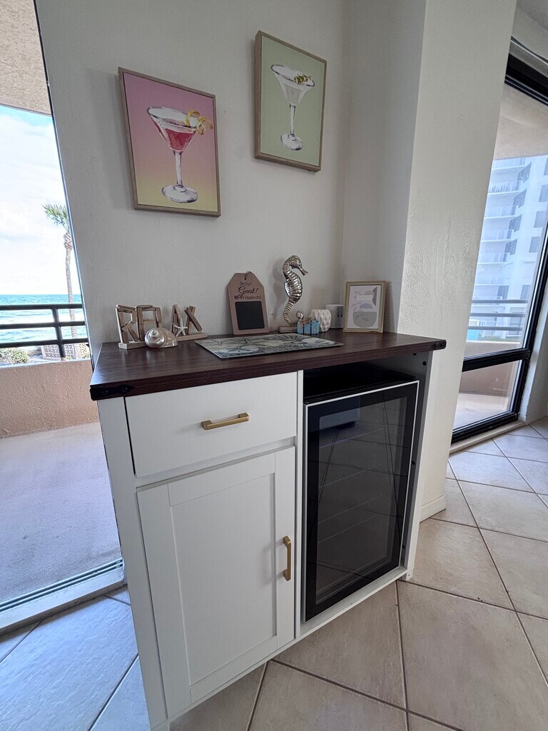 This fully furnished (utilities included) secret getaway is located in the quiet area of Daytona Beach Shores, but close to many local amenities. Convenience starts with a Publix Supermarket directly across the street with a Walgreens adjacent, and restaurants and entertainment just minutes away. Inside this oceanfront second floor condo you will enjoy a primary suite with adjoining full bathroom with a tub/shower combo and queen bed. The second bedroom offers a bunk bed complete with a bottom queen bed and twin bed on top. Both bedrooms have an ocean view. All brand new mattresses and linens provided. Another bonus is the utility room next to the hall bathroom, complete with a stacked washer and dryer! This corner condo is equipped with a full kitchen with stove/oven, microwave, dishwasher, full refrigerator, garbage disposal and large double sink and all essentials. For those that need extra beverage storage, utilize the wine cooler in the newly added beverage center. Fix all your drinks here to enjoy on the wrap around balcony, morning and nights! To relax inside, you will find a brand new comfy sectional sofa with a bonus queen sleeper inside, for any visiting family! Feel free to serve a big dinner on the brand new large dining table that seats 6 people. All utilities, WiFi and pest control is included. All bed and bath linens provided. Beyond the condo unit, this building offers its residents a quiet environment, one indoor pool, one outdoor pool, sauna, indoor hot tub, workout room, clubhouse, on-site building management, ample public parking, one dedicated secure basement garage parking, car wash area and secured entryways. Now, lets not forget the direct access to the beach for relaxing walks or ocean swims with family. We have beach equipment available for use.