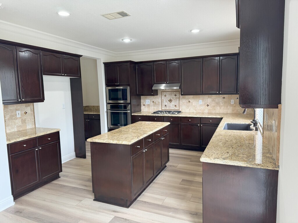 Welcome to this spacious home located at the top of the sought after Hillcrest Parkway! This captivating plan boasts 4 bedrooms and 3 bathrooms. Prepare to be dazzled by the numerous upgrades that adorn this stunning home, including crown moldings, new luxury plank flooring, new paint, and a new dishwasher to name a few. Step into the fabulous kitchen with an island, granite countertops, and travertine backsplash. Seamlessly transition into the casual breakfast area that flows into the inviting family room. The breakfast space even includes a custom-built in desk with granite countertops and additional cabinetry for storage. The kitchen also offers convenient entry to the spacious walk-in pantry and adjoining butler area. A formal dining room is conveniently connected to the kitchen. Picture cozy evenings by the fireplace with backyard access just steps away. The sliding door opens into a fully fenced and landscaped backyard with mature landscaping and privacy. The fireplace is double sided between the family and living rooms. A full bathroom is conveniently situated on the first floor. The spacious den with double doors is an additional room for activities, work, office space, or a fifth bedroom conveniently situated on the main level. Venture upstairs to discover 4 bedrooms, one of which being the primary bedroom with crown molding, a beautiful and spacious ensuite bathroom, and three spacious walk-in closets. The primary bedroom boasts a sitting area, and the ensuite includes a large bathtub and a spacious enclosed shower. The bathroom cabinets are 42 inches high with granite countertops, and the primary bath includes a separate lower vanity. Enjoy views of the surrounding hills from the primary bedroom windows or the bathtub. The remaining 3 upstairs bedrooms in this home are spacious with private closets. Enjoy the large loft area for playing, using as a second work/office area, TV room, or multifunction room. The spacious upstairs laundry room can fit a washer, dryer, and full ironing board, and even includes upper cabinets for storage. Next door to the laundry room is a large walk-in closet that adds even more storage to this spacious home. The backyard of this remarkable property is a private oasis! Revel in the beautiful hardscape and landscaping, with a spacious patio for outdoor entertainment. The location offers ample opportunities for outdoor recreation. Don't miss the chance to call this gorgeous home your own. Schedule a showing today and secure your place in this remarkable community! Includes gardening service.