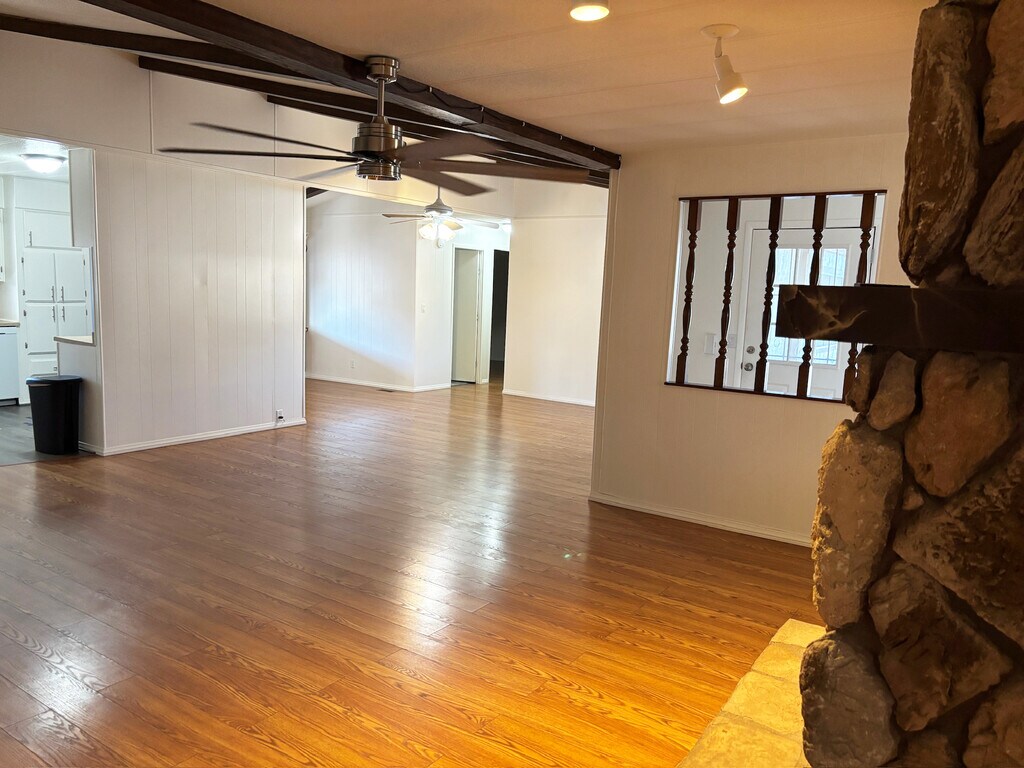 This 1,800 square foot home has 3-bedrooms, 2 full bathrooms and is in a fantastic over 55 community. With high ceilings and an open floorplan, you’ve got plenty of room to relax and entertain. The large primary bedroom has spacious his and hers walk in closets and an attached bathroom with a shower and a comfortable sunken bathtub. The additional bedrooms both have wall-to-wall closets for ample storage. The spacious living room has a fireplace and wood accents on the ceiling. In the kitchen you’ll find plenty of cupboard space, new flooring, a new top of the line refrigerator and a new gas top stove. The yard is maintenance free with places to sit outside on the front and back porches to enjoy your morning coffee or a beautiful sunset. An attached shed is a great place for tools and tinkering or can be used for storage. There’s a sizable sunroom for additional space. The property is equipped with essential amenities such as a laundry room with a washer and dryer, cable readiness and access to high-speed internet. The HVAC system was recently replaced so the heater and air condition work great so you can be comfortable all year long. Most of the windows have sunscreens to keep the house cooler. You can fit two cars under the covered parking, and a second driveway gives you additional spaces. The community features 2 swimming pools and a clubhouse where you’ll find a weight room and many community activities including for holiday dinners, crafts, exercise classes and game nights. The $108 HOA fee is to be paid by renters