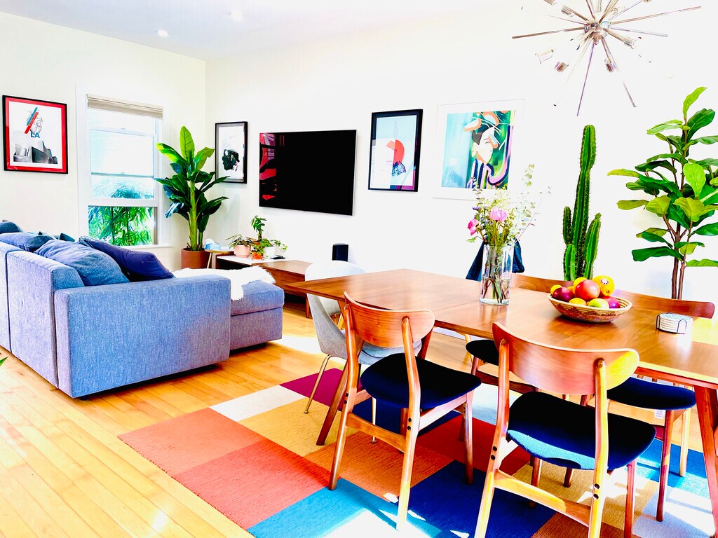 Escape to your urban oasis, a gated fully-detached private cottage. Quiet, serene, and tucked away from the street with a garden patio, sun-deck, and large 2-car garage. Enjoy the entire 1,400-sq-ft, two-level cottage with large windows, abundant light & hardwood floors. (Option to rent furnished or un-furnished.) Chef's kitchen, high-end mattresses, blackout blinds, large spa shower & deep soaking tub. Walk to Oracle Park (17 mins), Moscone Center (1 mile), UCSF (1 mile), SF MoMA (1 mile), Chase Center (1 mile), restaurants, cafes & casual eateries, like Marlowe & Philz Coffee. You'll enter your SF garden patio sanctuary through the door from your garage or from the gated entry from the sidewalk. Step through your gated courtyard patio garden lined with bamboo, cactuses, succulents, Calla Lillys, jade plants, and hydrangeas. Enjoy indoor-outdoor living in one of San Francisco's most centrally-located urban neighborhoods. Up one flight of stairs is your bright, private sun deck with sectional sofa (and coffee table and plenty of fun outdoor pillows) along with a lemon tree, rose bushes, sage, rosemary, lavender, flowers, and other succulents. Read, write, eat, recline, or work remotely outdoors on your laptop on the outdoor sectional sofa or at the red bistro table and chairs in the gated garden courtyard. Relax and entertain in style in the large, colorful, open concept living and dining room. It has high ceilings, large windows, original art, and wood flooring with abundant natural sunlight as well as recessed lighting. Sit back on the soft modern gray sectional sofa, and enjoy the 60-inch flatscreen Smart TV. Pour, shake, or stir yourself a glass of wine, cocktail, or refreshing drink at the mirrored midcentury bar cart. The bright open dining area has a mid-century modern table with seating for 6. Show off your cooking skills in our well-stocked chef's kitchen with Wolf gas range, stainless steel appliances, black granite countertops, dishwasher, coffee maker, coffee grinder, and tea kettle. Plenty of dishes, pots, pans, silverware, knives, and utensils, and a breakfast cafe table with two cafe stools. Soak in the deep soaking tub in the upstairs bathroom. Succulents and beautiful calming mid-century modern blue tile, as well as organic cotton bath towels round out the experience. Downstairs, a large tiled shower has both an overhead shower head and second additional handheld shower head. The downstairs bathroom has two separate vanities and sink areas. Also, Toto toilet with bidet, and organic cotton towels. In the large and incredibly quiet primary bedroom, you'll get the deepest most incredible sleep cuddled up on a King-size organic Essentia memory foam mattress and memory foam pillows + down pillows as well as down-alternative options. Custom black-out blinds pull down to cover the large windows in complete darkness for sleeping. Organic cotton sheets and duvet, plus a window seat, desk, office chair, and walk-in closet. In the 2nd bedroom, you'll get remarkable comfort and rest on a high-end queen-size pillow top mattress with organic cotton sheets, high quality down pillows and duvet. The 2nd bedroom also has custom blackout blinds to cover windows in complete darkness for sleeping. Original art and prints, and clean modern white oak floors. 2nd desk and office chair. In-unit WASHER & DRYER. Hideaway stacked Bosch washer/dryer in a hall closet near the bedrooms. This 119-year-old historic 1906 cottage was renovated and updated with luxe amenities in 2010 and 2020, and it still holds much of its old San Francisco style and charm. HIDEAWAY 3rd DESK/OFFICE AREA Plenty of places to work remotely, read, and study. There are desks and chairs in both bedrooms, and a 3rd pull-out desk/office area. WASHER & DRYER Hideaway stacked Bosch washer/dryer are on the ground floor hallway. GARAGE & STORAGE SPACE Huge private garage can fit 2 mid-size SUVs (tandem) plus a motorcycle and there's room to work out plus plenty of extra storage space. NOTE: The large garage accommodates 2 cars + 1 motorcycle.
