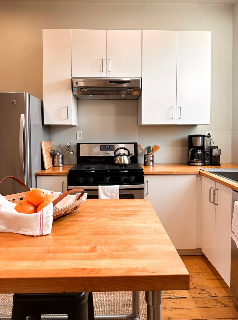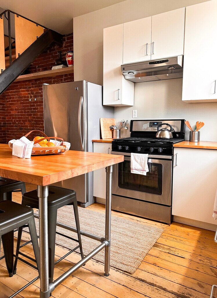 Stunning Furnished Doughboy Square Rowhouse Renovated beautifully designed and *furnished* 3-story brick rowhouse, with raised rear deck and backyard & off street parking two blocks from Doughboy Square in lower Lawrenceville. 2 bedrooms (main br is entire third floor suite with private bath) 2 full baths High-efficiency whole house heating and AC system with customizable high-low registers for maximum comfort year round. Office and convenient laundry area on second floor with new, electronic stacked GE Washer/Dryer Clean modern kitchen w/stainless appliances, gas 5-burner range Natural floor-to-ceiling slate in bathrooms Cast-iron tub in 2nd floor bath Walk in custom tiled shower in 3rd floor bath Contemporary faucets and fixtures Recessed dimmable lighting throughout Chrome 3 stage ceiling fans throughout Custom designed steel railings and safety rails 1st floor open layout with new, widened custom staircase Hydraulic spring-operated basement storage entry creates fully open pass-through first floor space Custom salvaged wood detail and shelving Restored original heartwood pine floors throughout, New, exterior raised concrete patio area Additional rear yard space for enjoyment and gardening *Dedicated OFF STREET PARKING for 1-2 vehicles* and permit-free no hassle street parking in front High speed FIOS internet installed, integrated outlets for routers/direct connection throughout home. Plenty of basement storage. This home was designed for customers seeking a high quality long term furnished property and comes equipped with everything you could want for an effortless stay. Kitchen is FULLY EQUIPPED with high quality cookware and accessories including All Clad stainless pans, cast iron pans, high quality cutting knives, full plate service by Alessi, Boos Block table/island, etc. High quality mattresses and all natural material bedding including down comforters and pillows. Vintage mixed w new furnishings throughout art, custom top down bottom up blinds for light and privacy. TV/lounge area and private bath in 3rd floor bedroom suite with sprawling views. Located 1.5 blocks from Doughboy Square at the entrance to the lower Lawrenceville commercial district, this home is within minutes of the Strip District, Polish Hill, Bloomfield and "Downtown" neighborhoods. Beautiful views of Troy Hill and adjacent neighborhoods. Many major bus routes accessible within minutes of front door. HealthyRide bike share hub nearby. Coffee, juice, wellness and health as well as a wide range of high quality restaurants, bars, shopping and recreation options accessible in minutes by foot. Family operated convenience store seconds away for necessities.