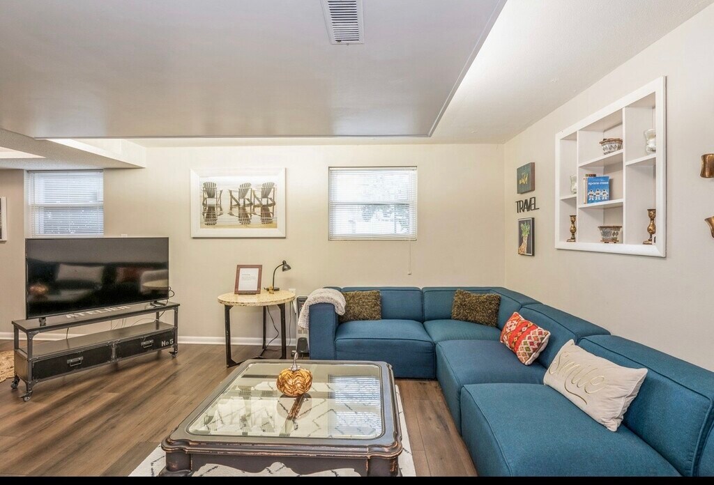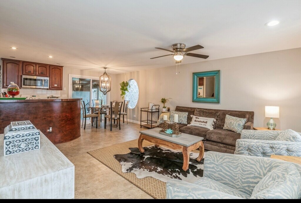 Discover the comfort of this single-family home, distinguished by its inviting frontdeck and fire pit, a quaint patio, and a covered porch featuring a relaxing hammock. The oversized detached garage and driveway offer parking for up to four cars. Nestled in a neighborhood adjacent to a scenic lake with a sandy beach, guests are encouraged to explore and indulge in the tranquil surroundings. Culinary delights await at nearby restaurants, ensuring a satisfying experience. Explore the prime location of this residence, just a stone's throw away from Gurnee Mills shopping, entertainment, and the thrilling Six Flags theme park. With a short 8-mile drive to the Naval base, 5 miles to Independence Grove, and mere steps (0.2 miles) from the College of Lake County, this home provides easy access to various attractions.