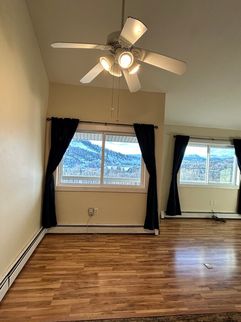 Downtown living with amazing views. Walk to downtown restaurants, shopping, Howellsen Hill and the Yampa River. Watch beautiful sunsets and the activities at Howellsen from your private balcony or living room. 2 full bedrooms plus loft and 2 bathrooms. Large laundry/mudroom and carport parking below unit for 2 cars. Remodeled kitchen with gas stove and bar area, dining area with ceiling fan and large living room along with 1 bedroom and full bath on main level. Lower level has entry, storage, laundry, 1 bedroom with new carpet and bathroom. Upper most level has loft. Looking for a lease through August 2026 with move in date of December 15. Gas, Electric, water, internet paid by tenant First month, last month and security equal to 1 month prior to move in.