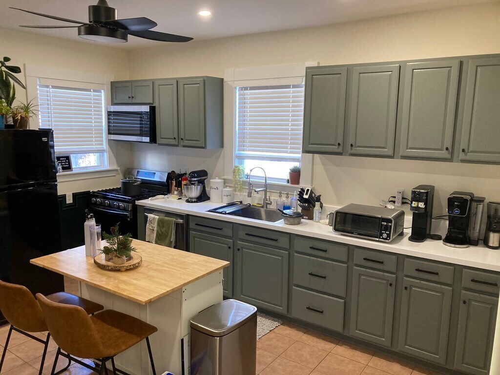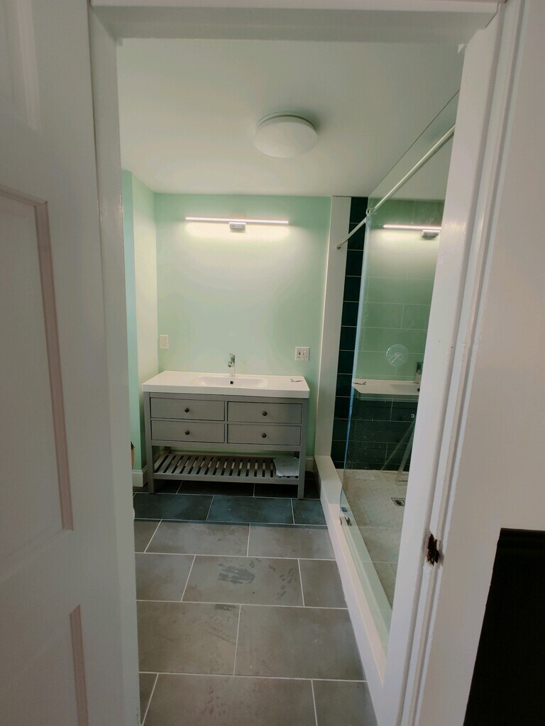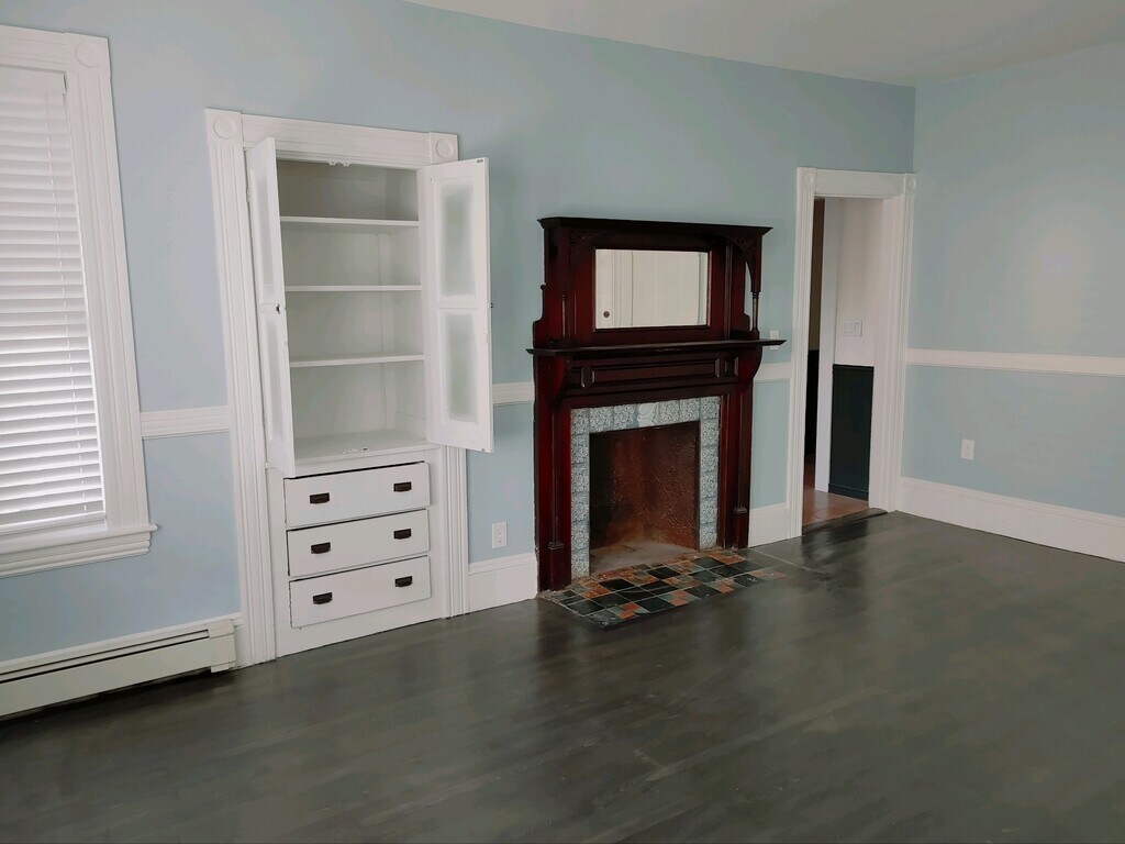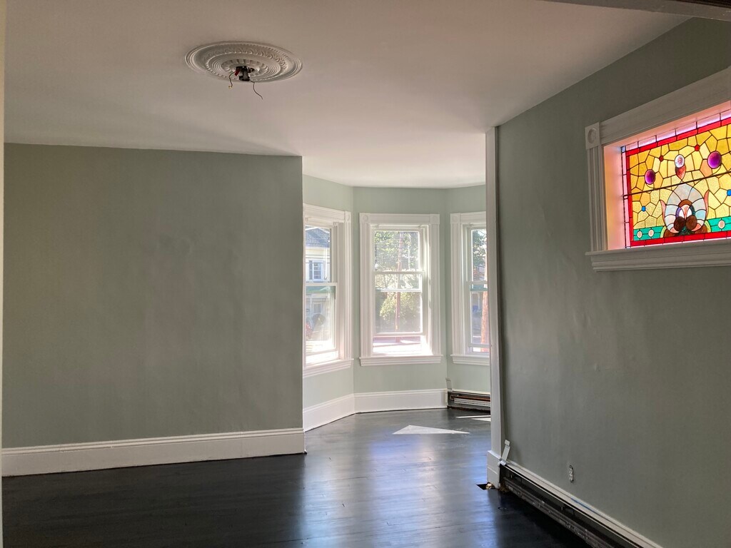 Recently renovated large, sunny, one-bedroom apartment in a classic refurbished Victorian house. Large, tiled, walk-in shower with three shower heads (including a rain shower), shower bench, and glass sliding door. Seeking quiet and respectful tenant(s). This modernized apartment is located on the 1st floor with high ceilings and has a private side entrance right off the kitchen and next to dedicated parking space. No dogs, sorry! No rental fees! Apartment includes a large eat-in kitchen (with walk-in pantry, stainless steel appliances, including dishwasher and an above-range microwave), full bathroom (100% renovated), living room (with antique mantle and fireplace [not functional], refinished hardwood floor, walk-in closet, ceiling fan, and built-in bookcase), and large bedroom (with stained glass window, refinished hardwood floor, ceiling fan and an extra front "turret" room that's perfect for an office or sitting room or maybe yoga?). Easy access to shared laundry equipment in the basement via stairs right off the kitchen. The apartment comes with one off-street parking space on the property, with easy, free on-street parking for a second car; no city parking permits required. Large porch across front of house and backyard garden great for hanging out and having a cookout/BBQ. Located near the Newton line, also close to Watertown. Short walk to Moody Street and downtown Waltham with great restaurants, movie theater, and nearby public transportation (buses, Green-line T, and the Commuter Rail). Mass Pike (Rt. 90), Rt. 95/128 and Rt. 2 are all a short drive and it's only 15 minutes to Boston! Tenant pays for gas (heat with a Nest thermostat), electricity, and cable/internet. Available January 1st (possibly a little sooner) for a 1-year lease .