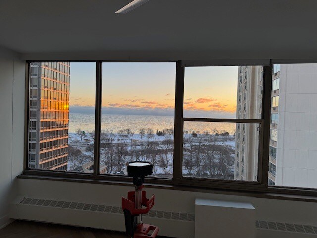 This home stands out for its unique corner layout, incredible light, and spacious room sizes. A true urban sanctuary in a prime location. Appreciate living just steps from the lakefront, Lincoln Park, public transportation, dining, shopping, and everything East Lakeview has to offer. A rare opportunity to rent a bright, spacious corner unit in one of Chicago's most desirable neighborhoods. This apartment is a northeast corner 1-bedroom, 1-bath condo at 360 W. Wellington in East Lakeview. This 17th floor, spacious residence, bounded by a curtain wall of oversized windows, is flooded with natural light. The windows provide neighborhood and lake views from every room. The oversized living, dining, and kitchen area is perfect for both relaxing and entertaining. This area features warm herringbone pattern floors and ample space for a variety of furniture layouts. The window treatments are electronically controlled. The large bedroom accommodates a king-size bed and eleven feet of closet space. This room can accommodate additional furniture without comprising the bright and airy feeling. Both closets feature adjustable wire shelving. A silent ceiling fan provides circulation when needed. The window treatments are electrically controlled. The kitchen offers abundant cabinetry, new stainless appliances, and a large counter space, making daily cooking easy and functional. In addition to washing dishes incredibly clean, the Bosch dishwasher is inaudible when running. The bathroom features a walk-in shower, an oversized medicine cabinet, and a vanity with amble storage space. Adjacent to the bathroom is a linen closet and a large storage closet. The welcoming entry foyer provides a natural flow and separation from the living space. It features a deep closet that is four feet wide. The single monthly rental fee covers all utilities including standard cable and internet. There are no additional expenses.